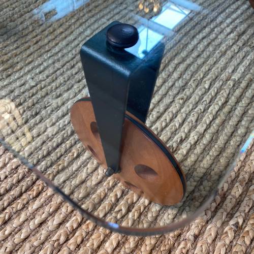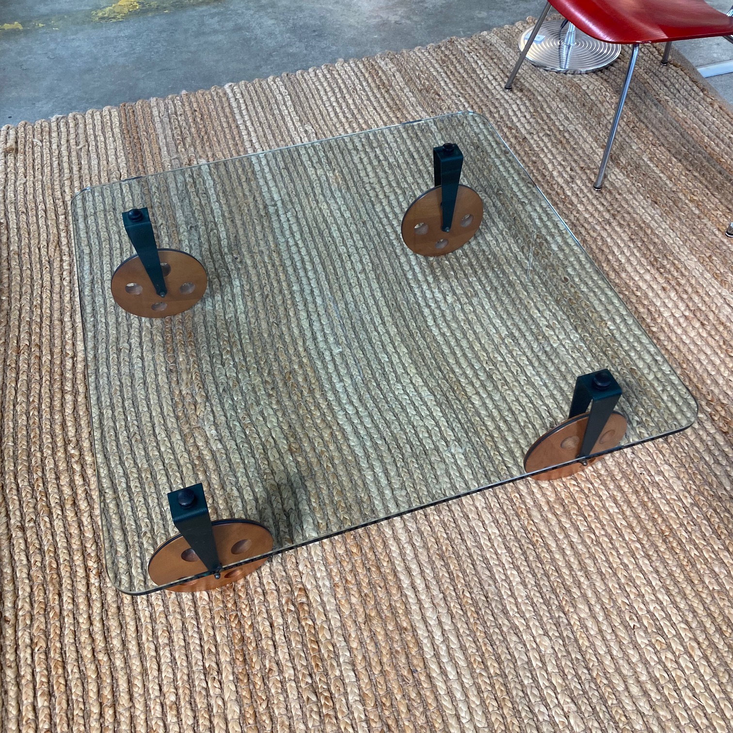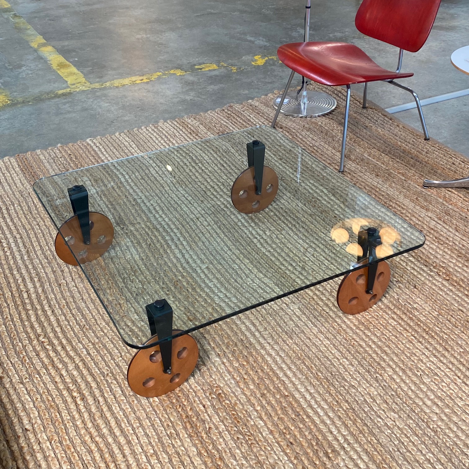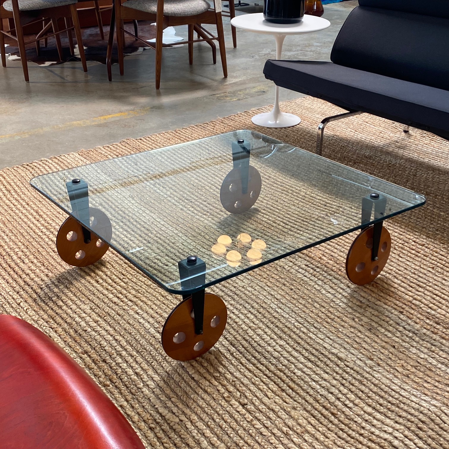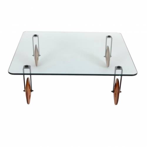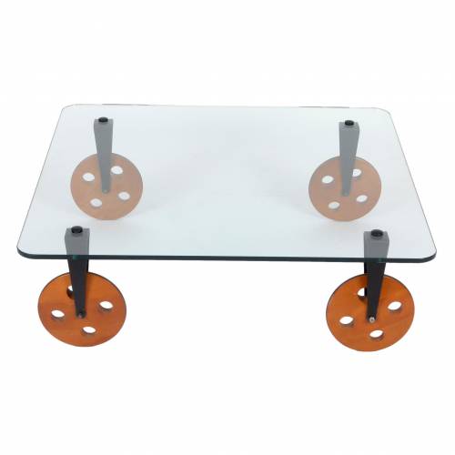 1970s Gae Aulenti for Fontana Arte coffee table on large wooden wheels, made in Italy.