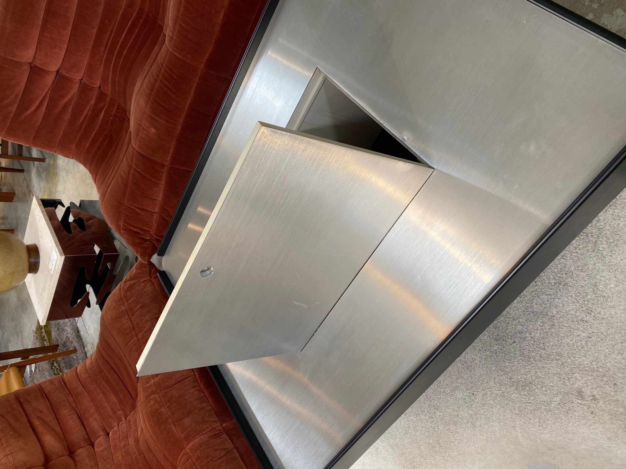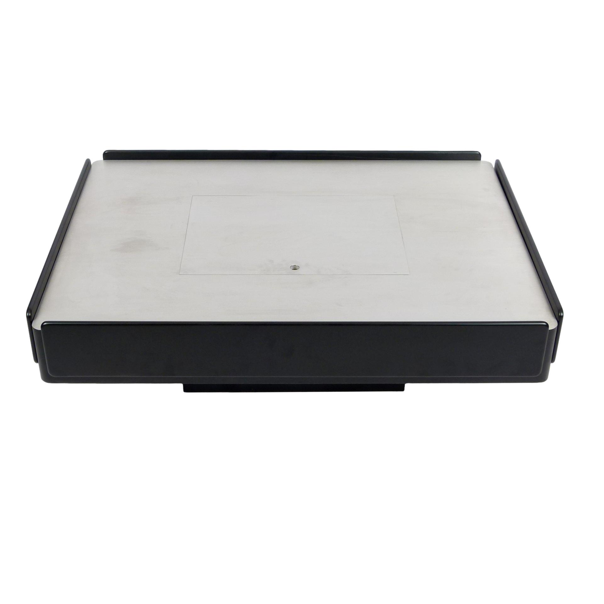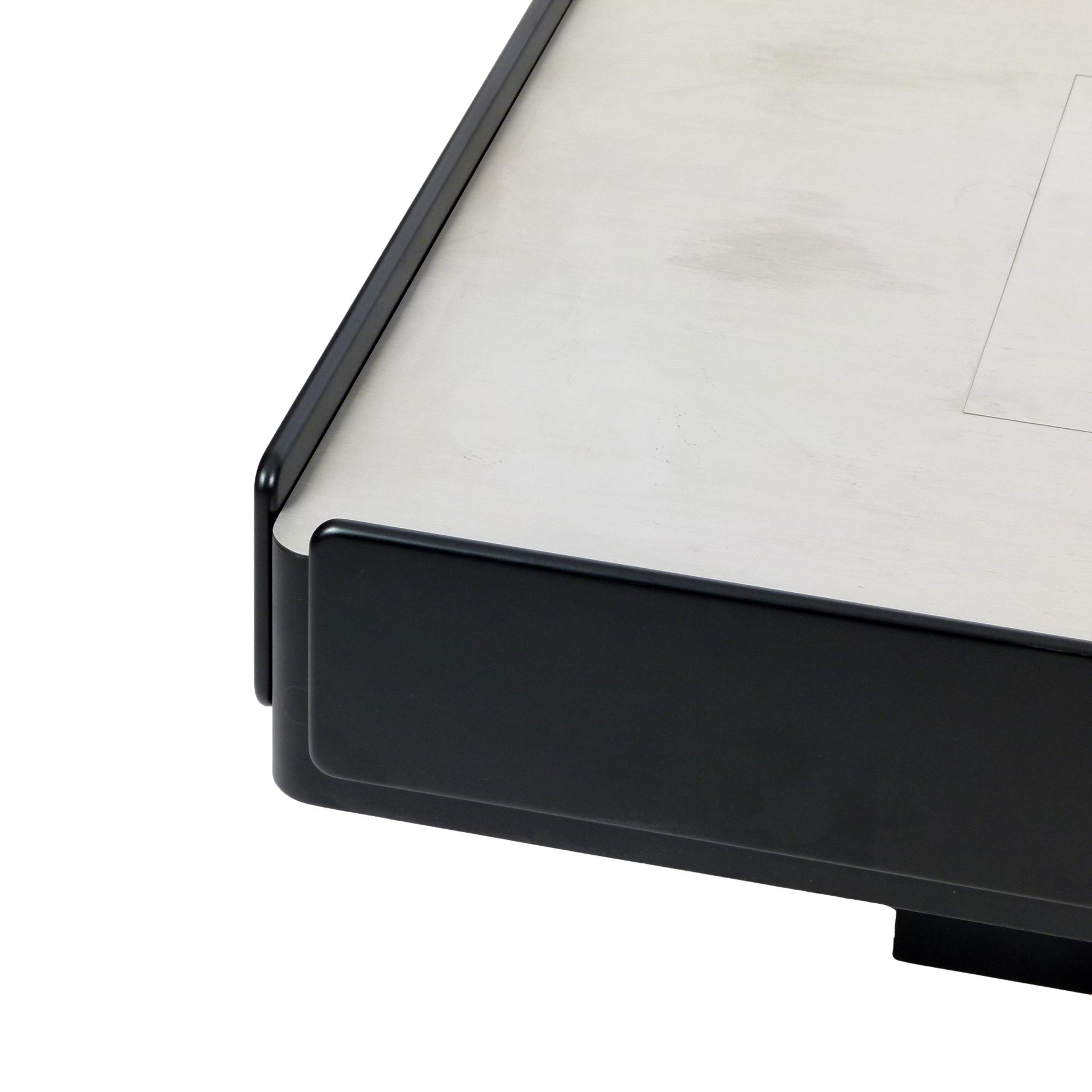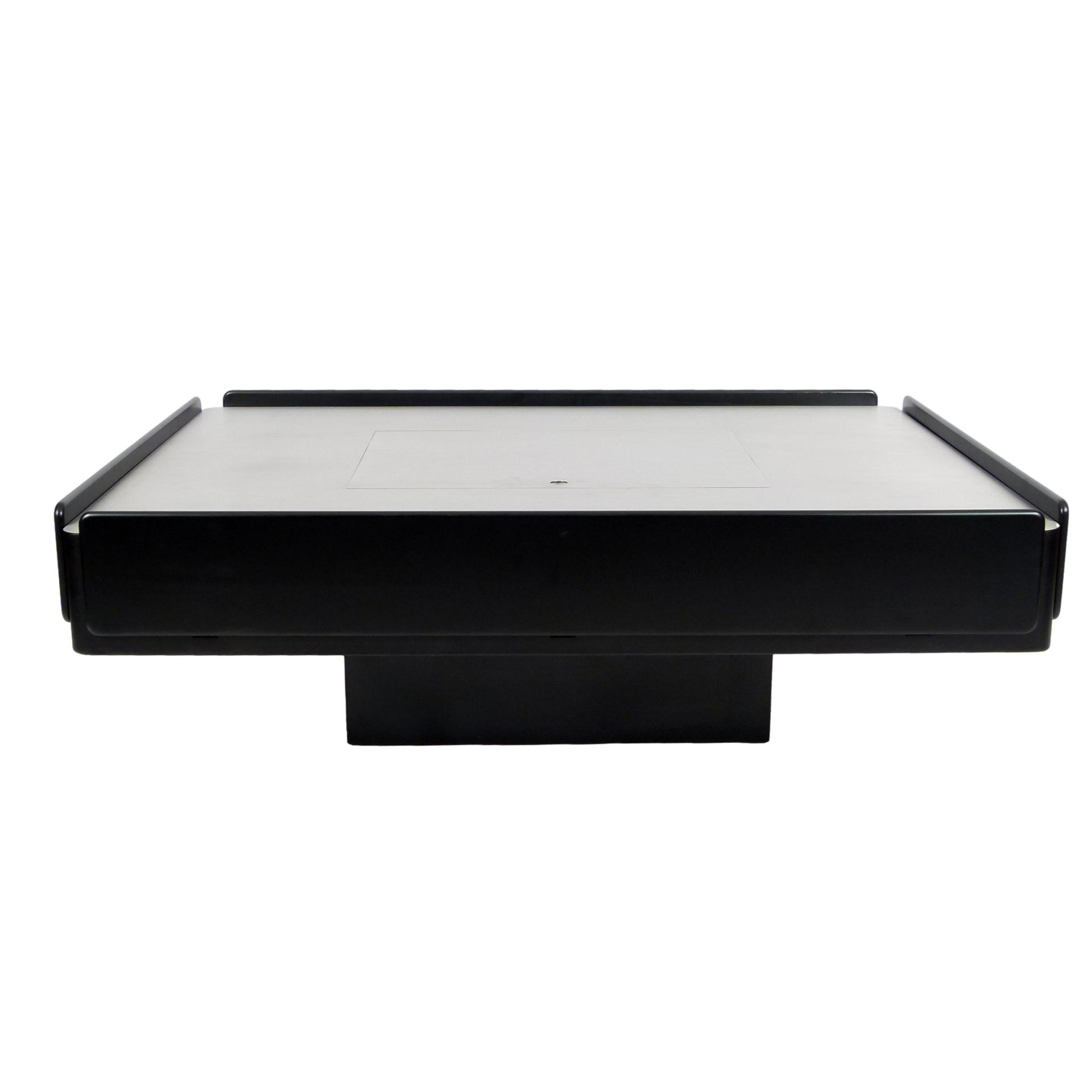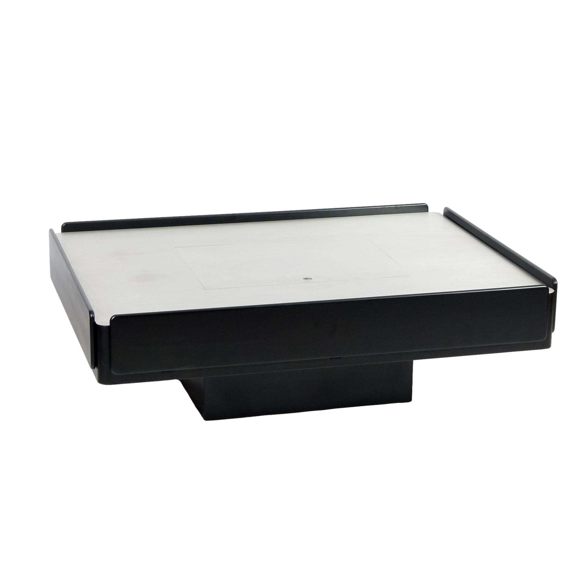 1960s "Caori" aluminum and lacquered wood coffee table by Vico Magistretti for Gavina, Italy. Feature a drawer on each end, drop down sides, and center book/record storage.