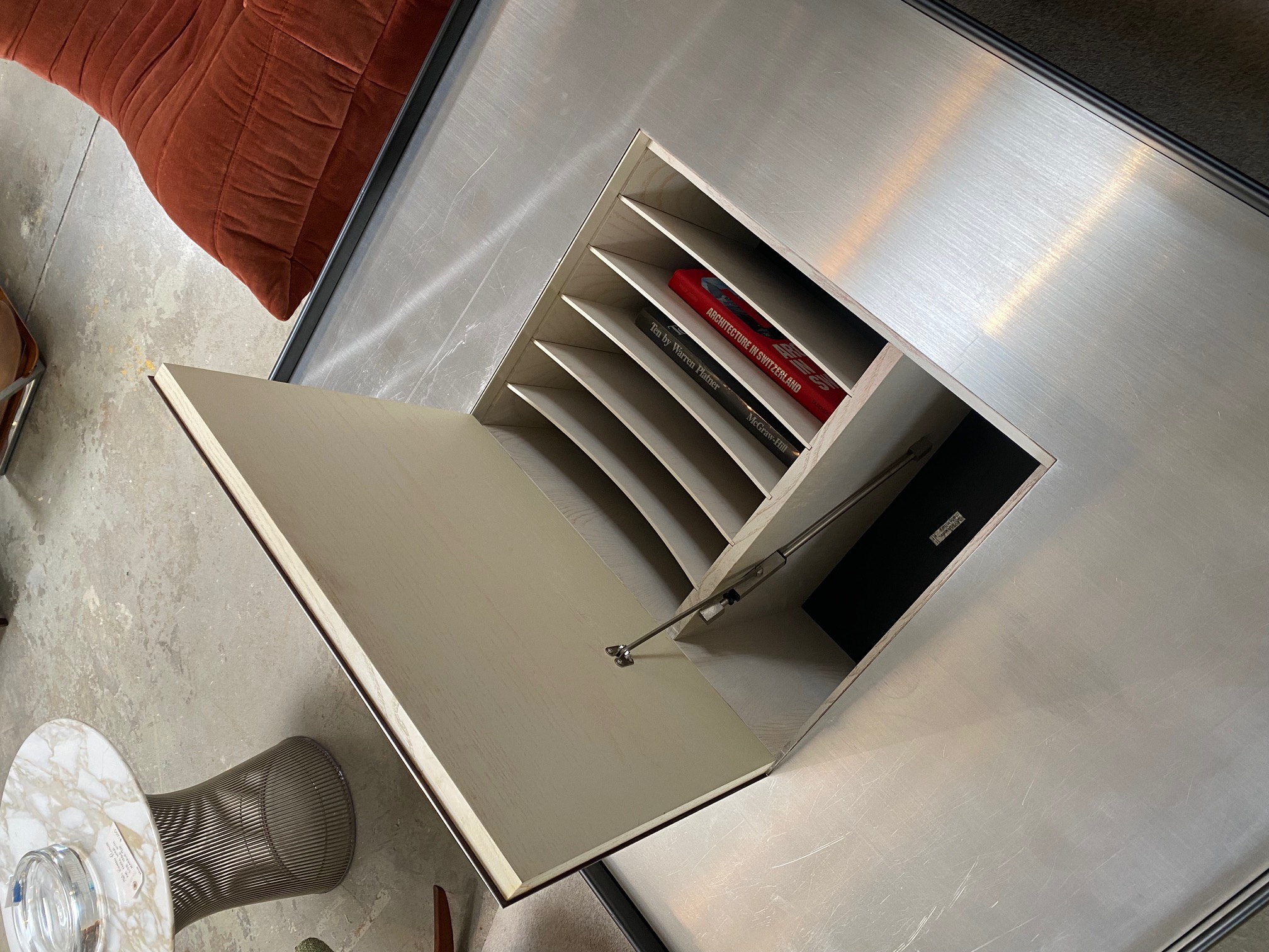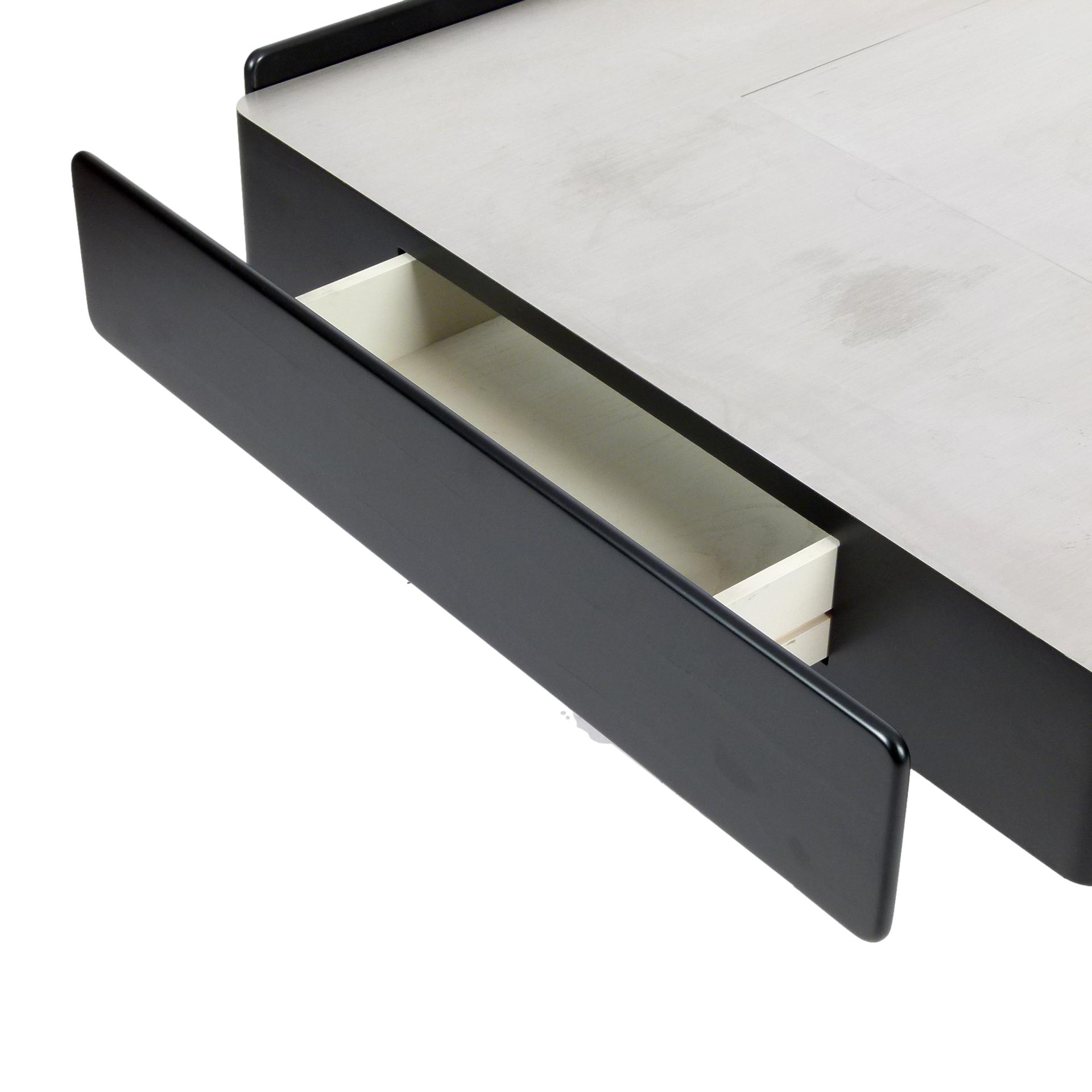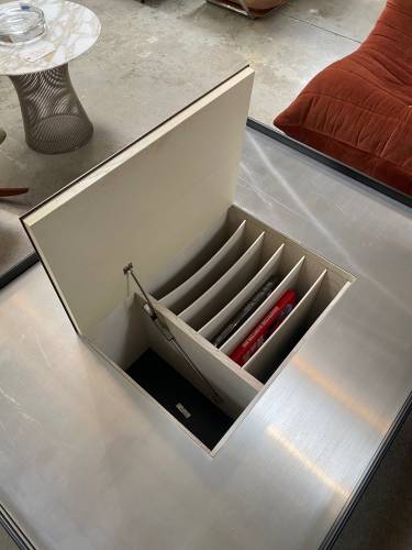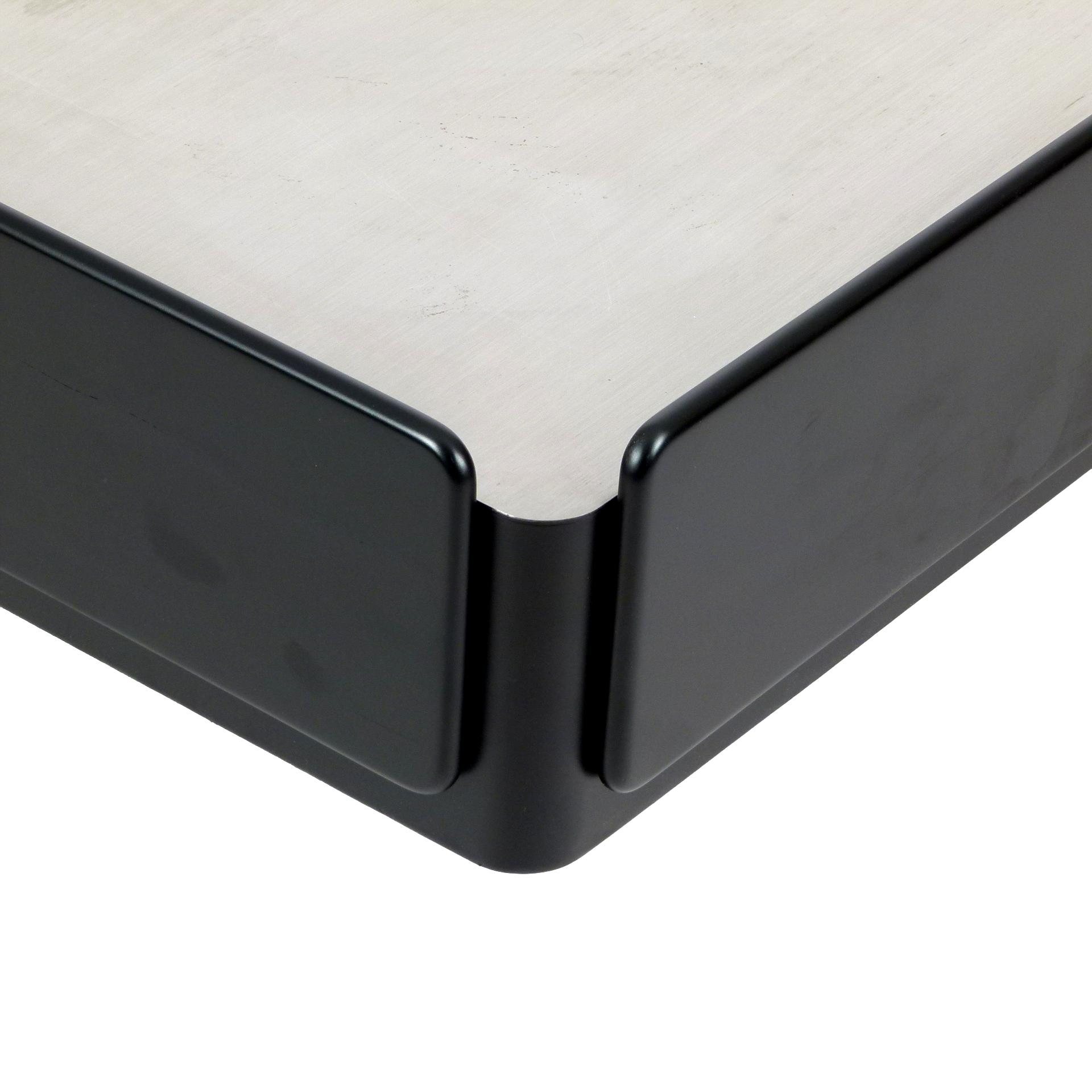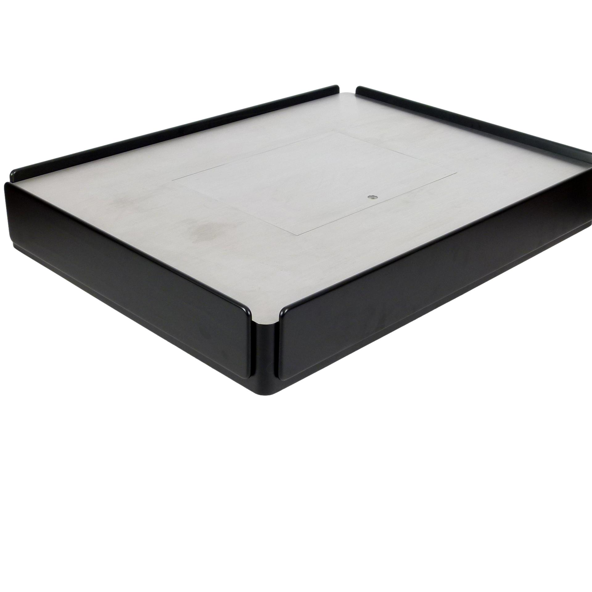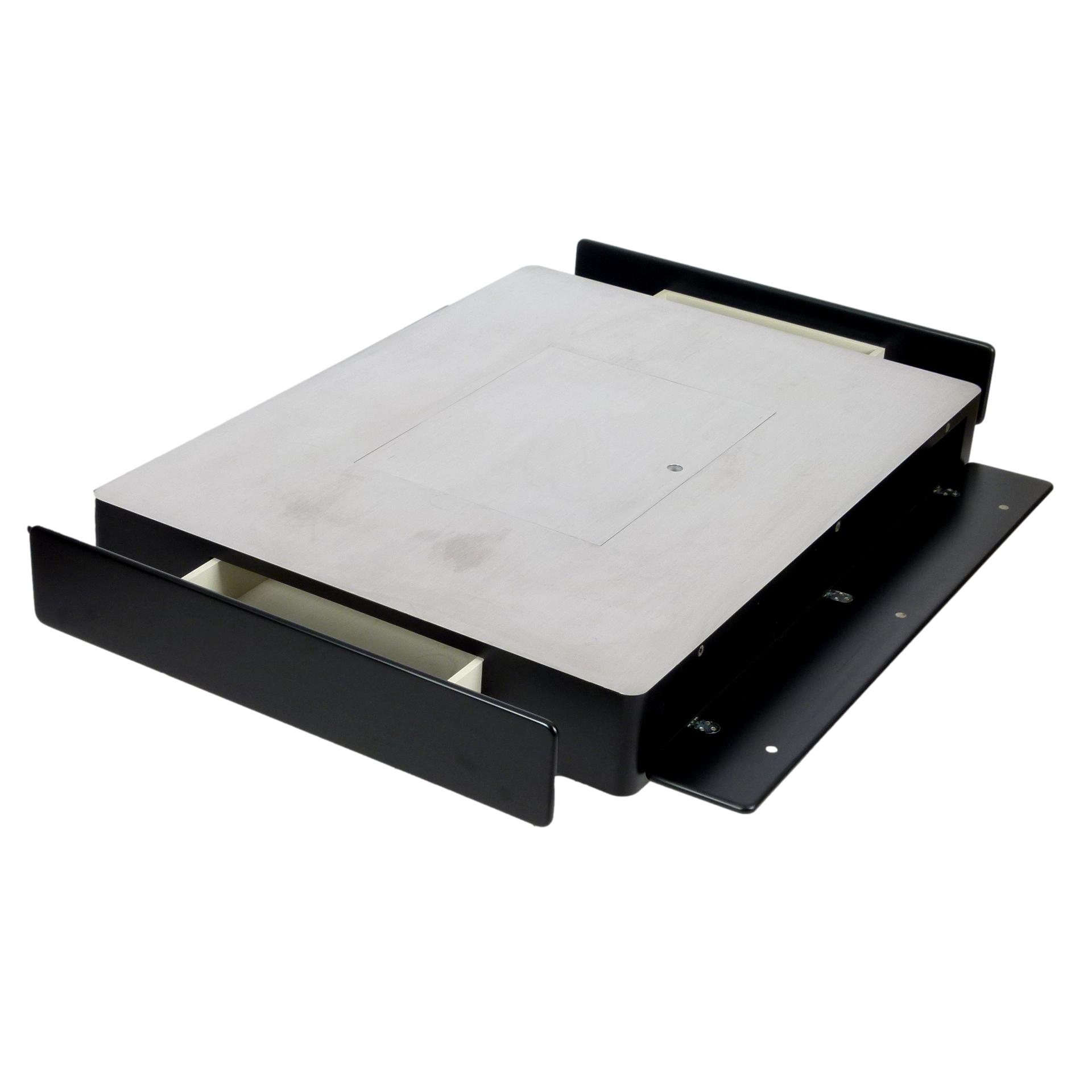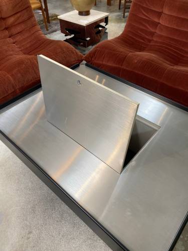 1960s "Caori" aluminum and lacquered wood coffee table by Vico Magistretti for Gavina, Italy. Feature a drawer on each end, drop down sides, and center book/record storage.