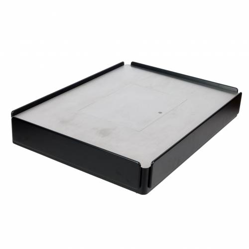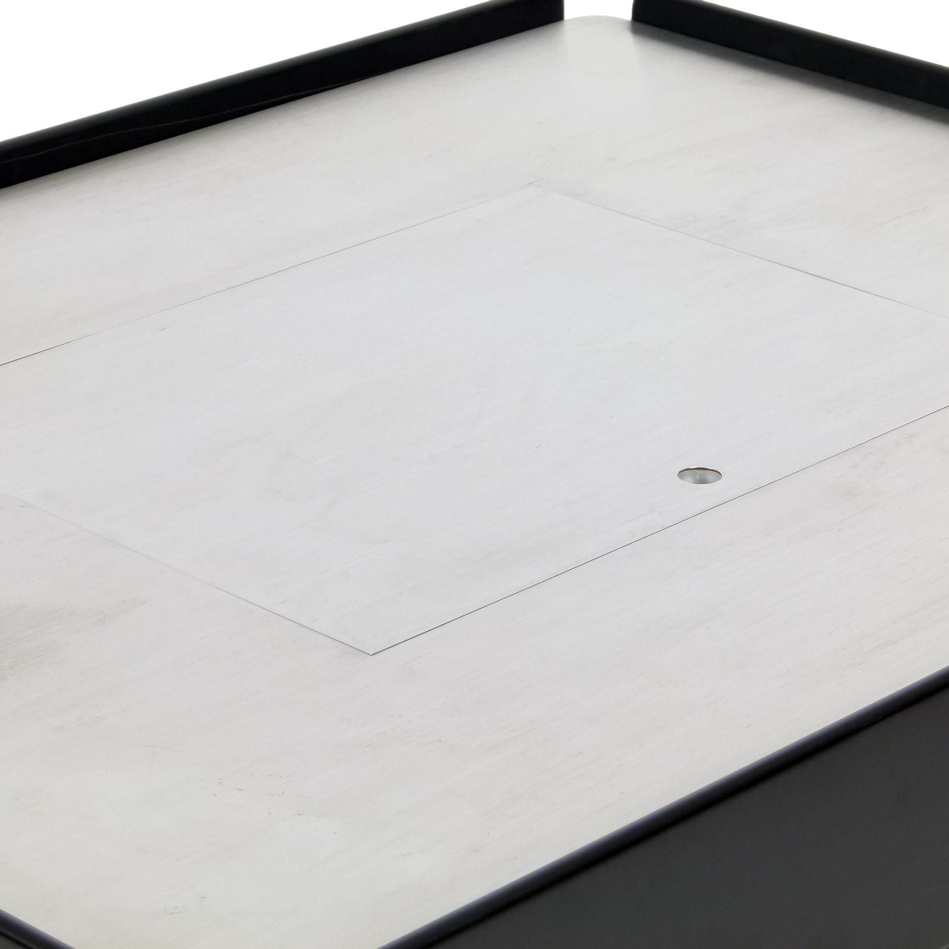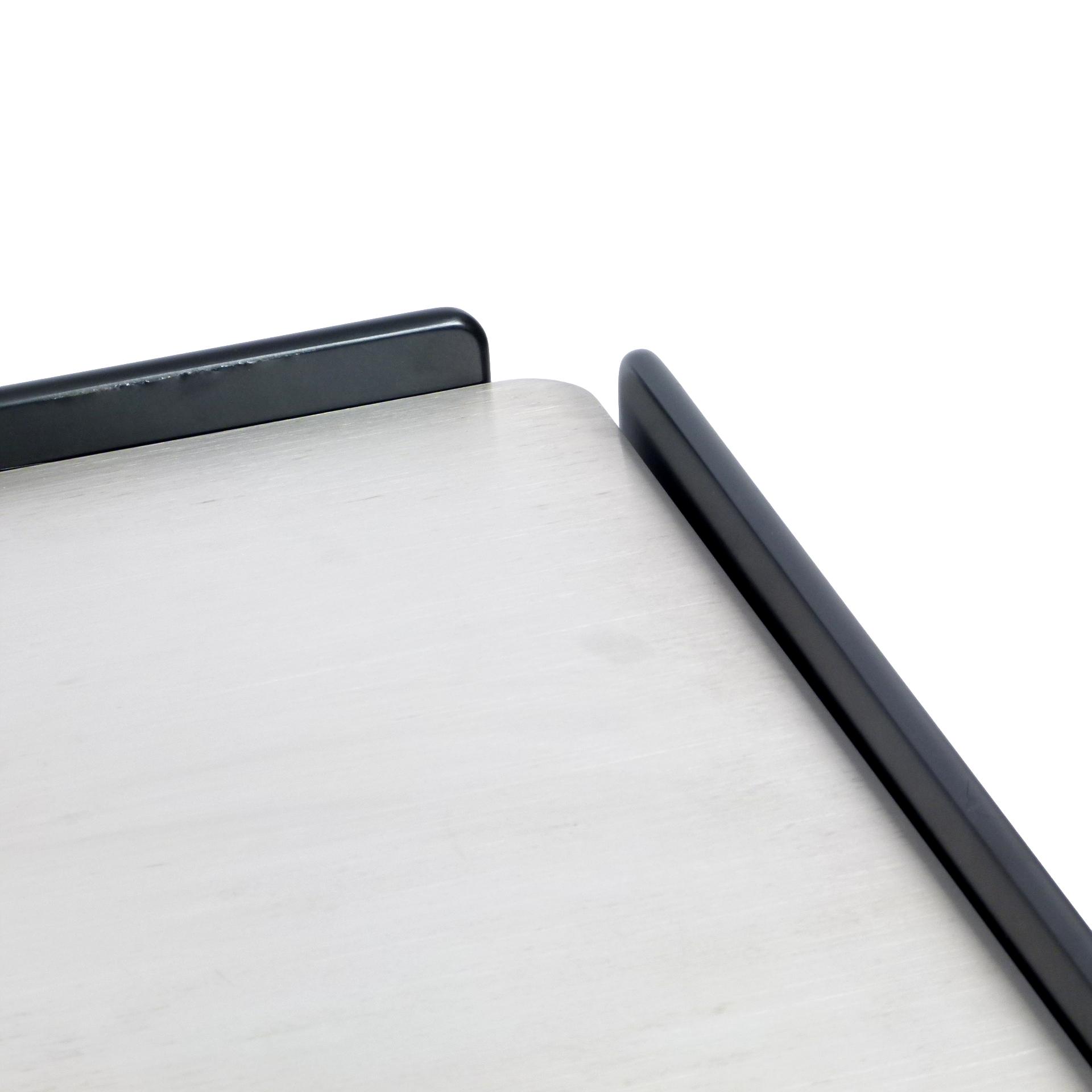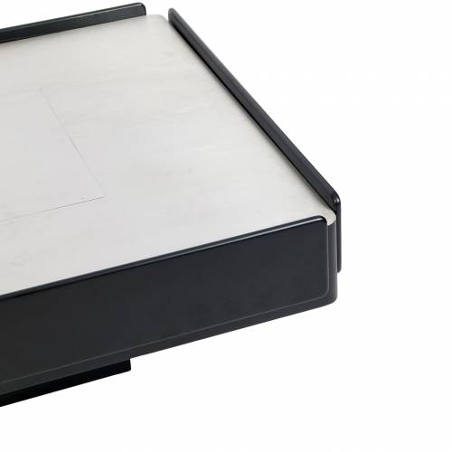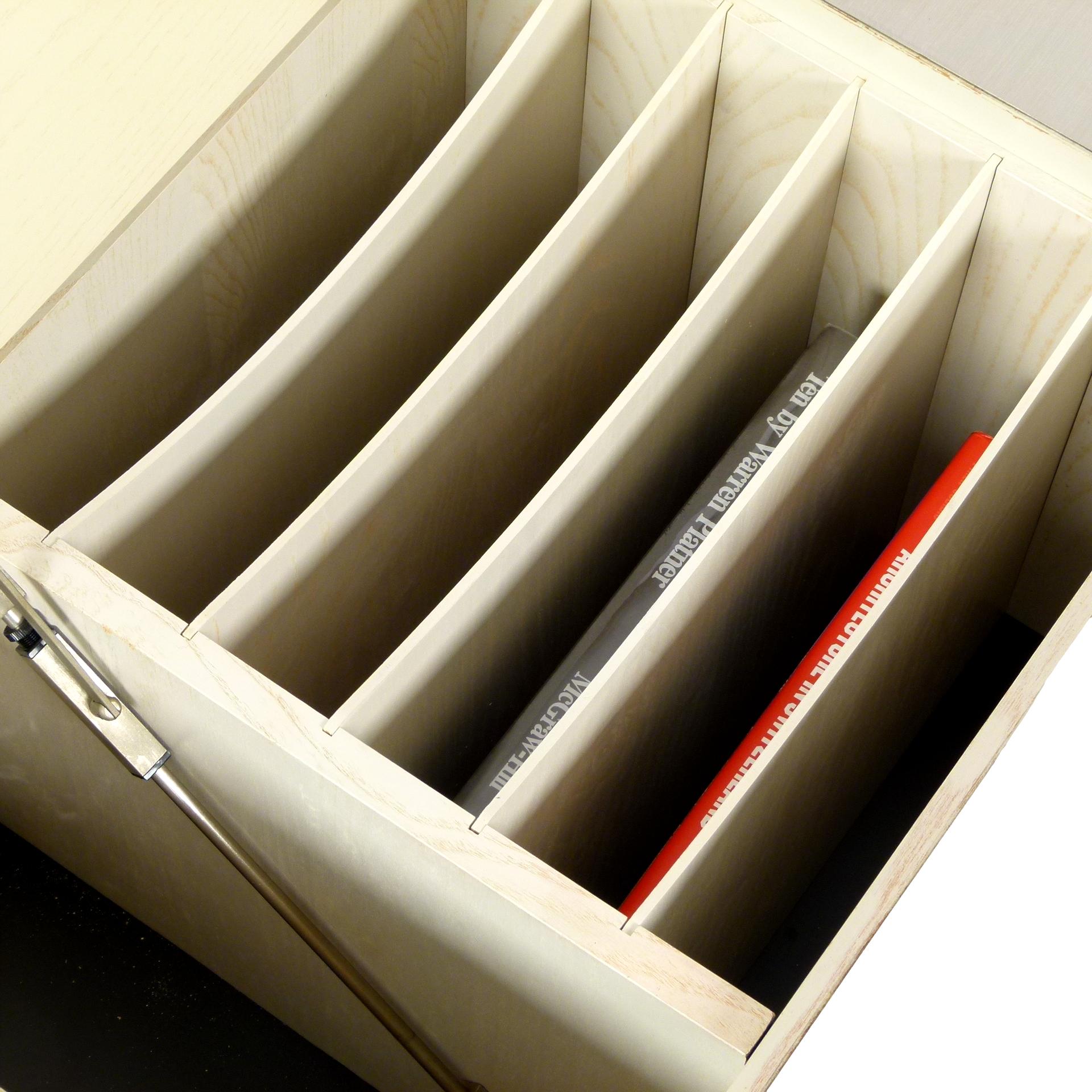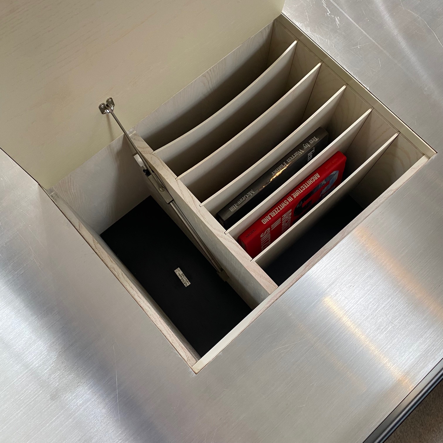 1960s "Caori" aluminum and lacquered wood coffee table by Vico Magistretti for Gavina, Italy. Feature a drawer on each end, drop down sides, and center book/record storage.