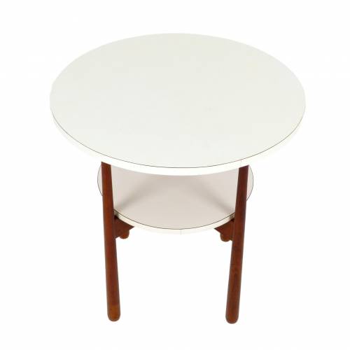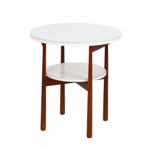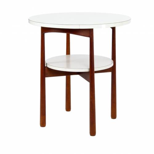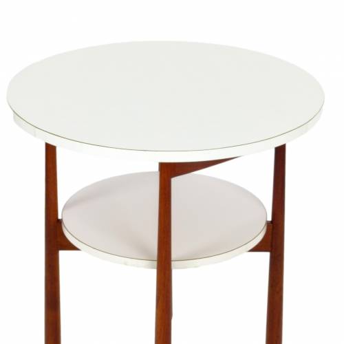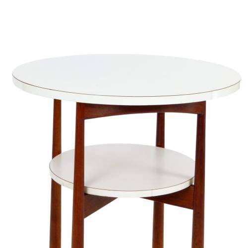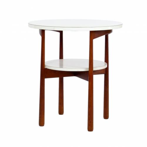 1960s Jens Risom two-tier walnut and white laminate side table/pedestal.