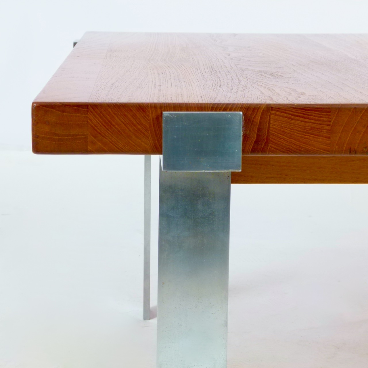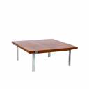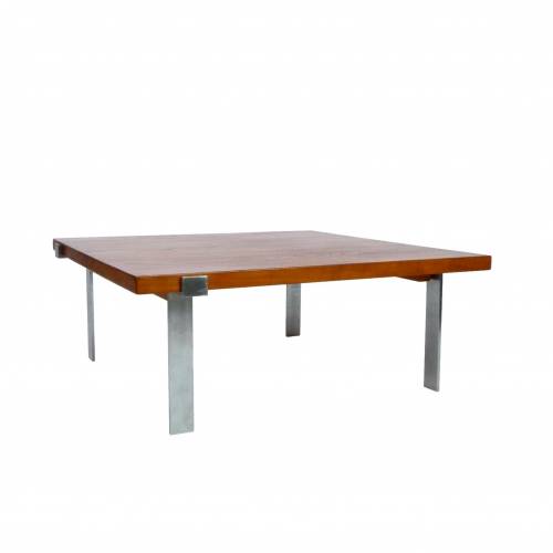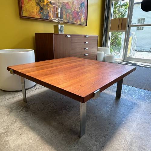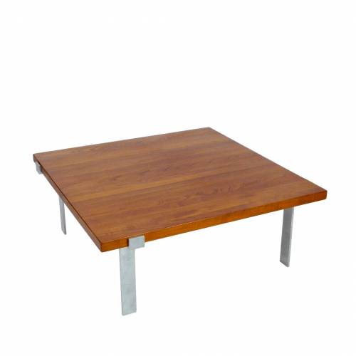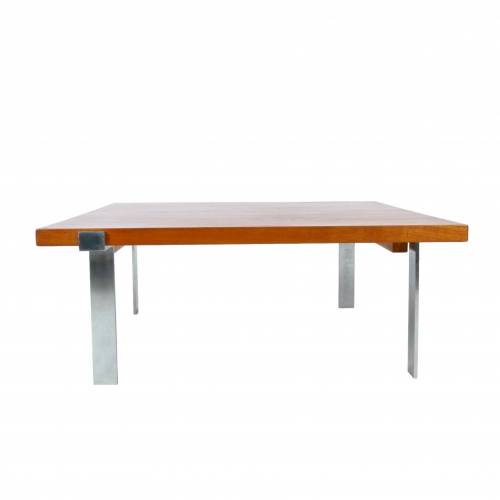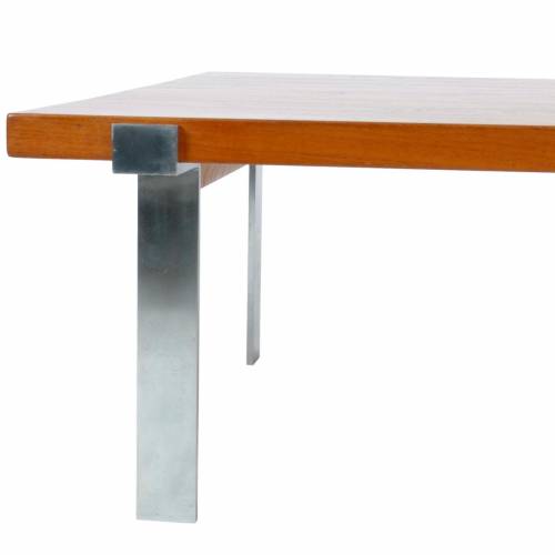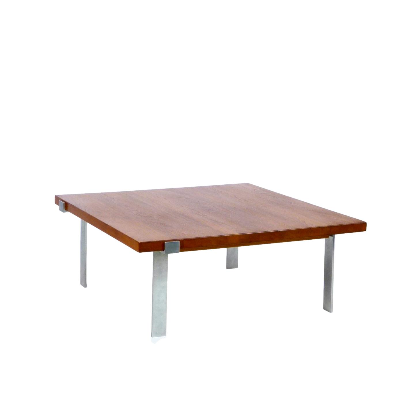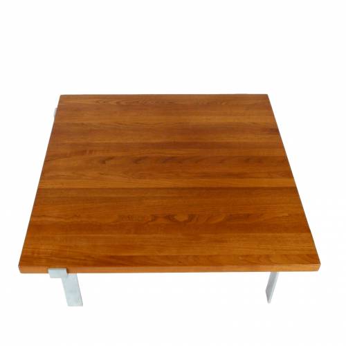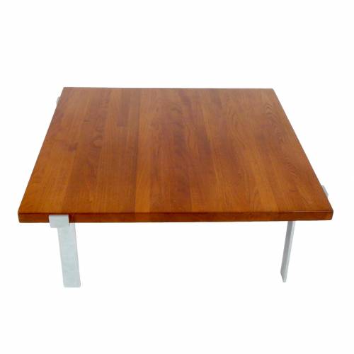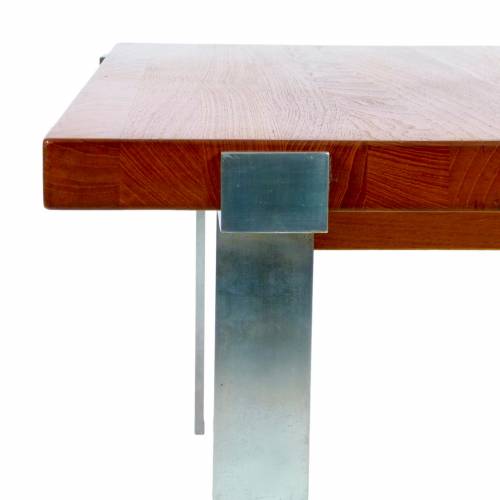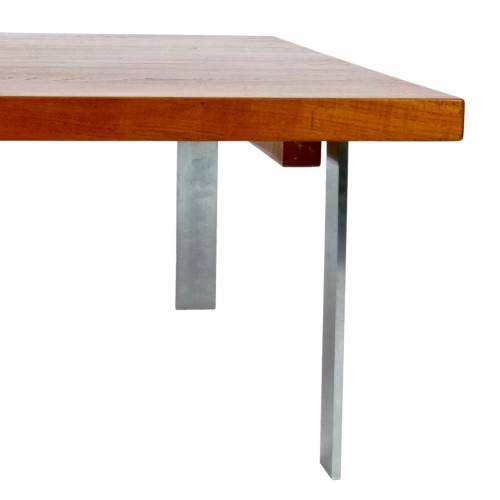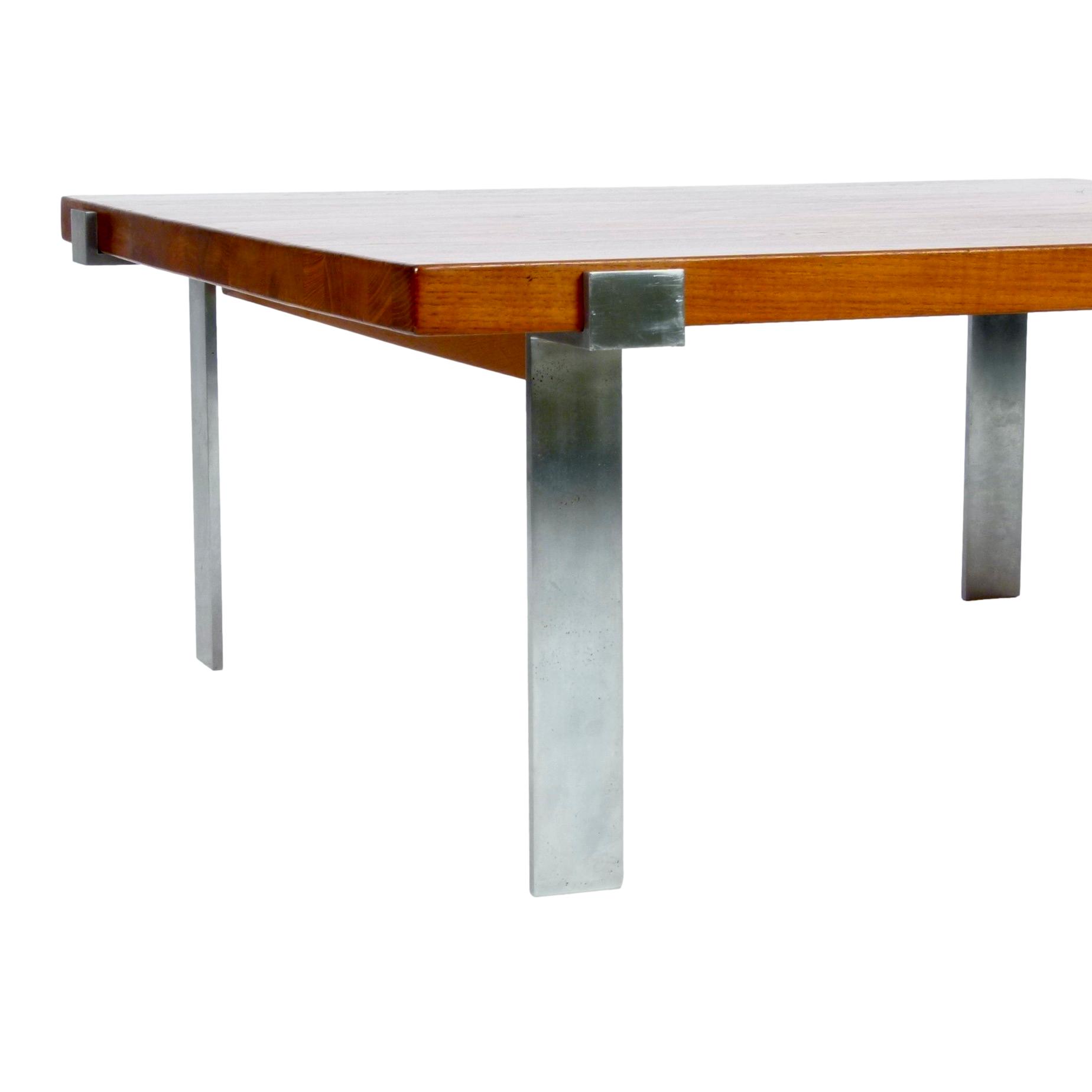 1960s coffee table designed by Jørgen Høj for A. Mikael Laursen, Denmark. Solid 1.5" teak top over fabricated brushed steel base.