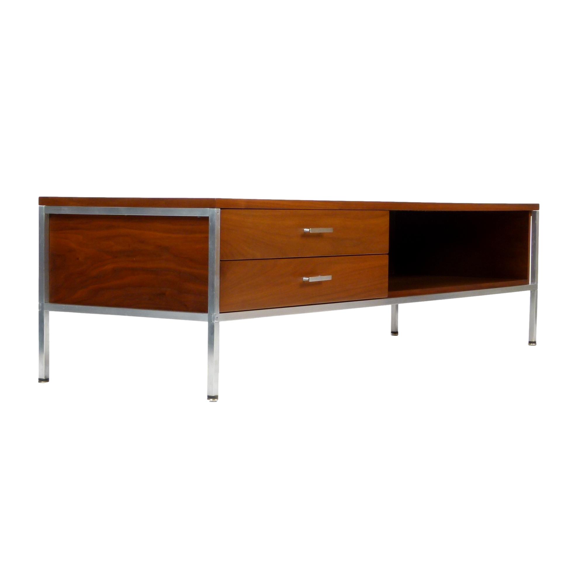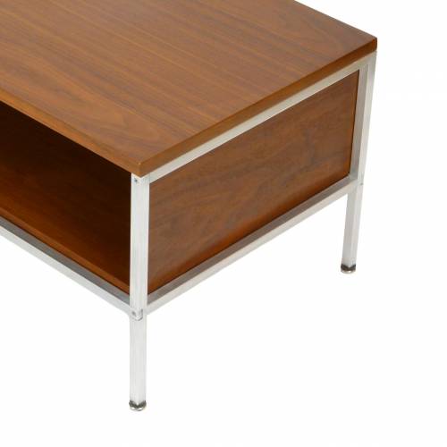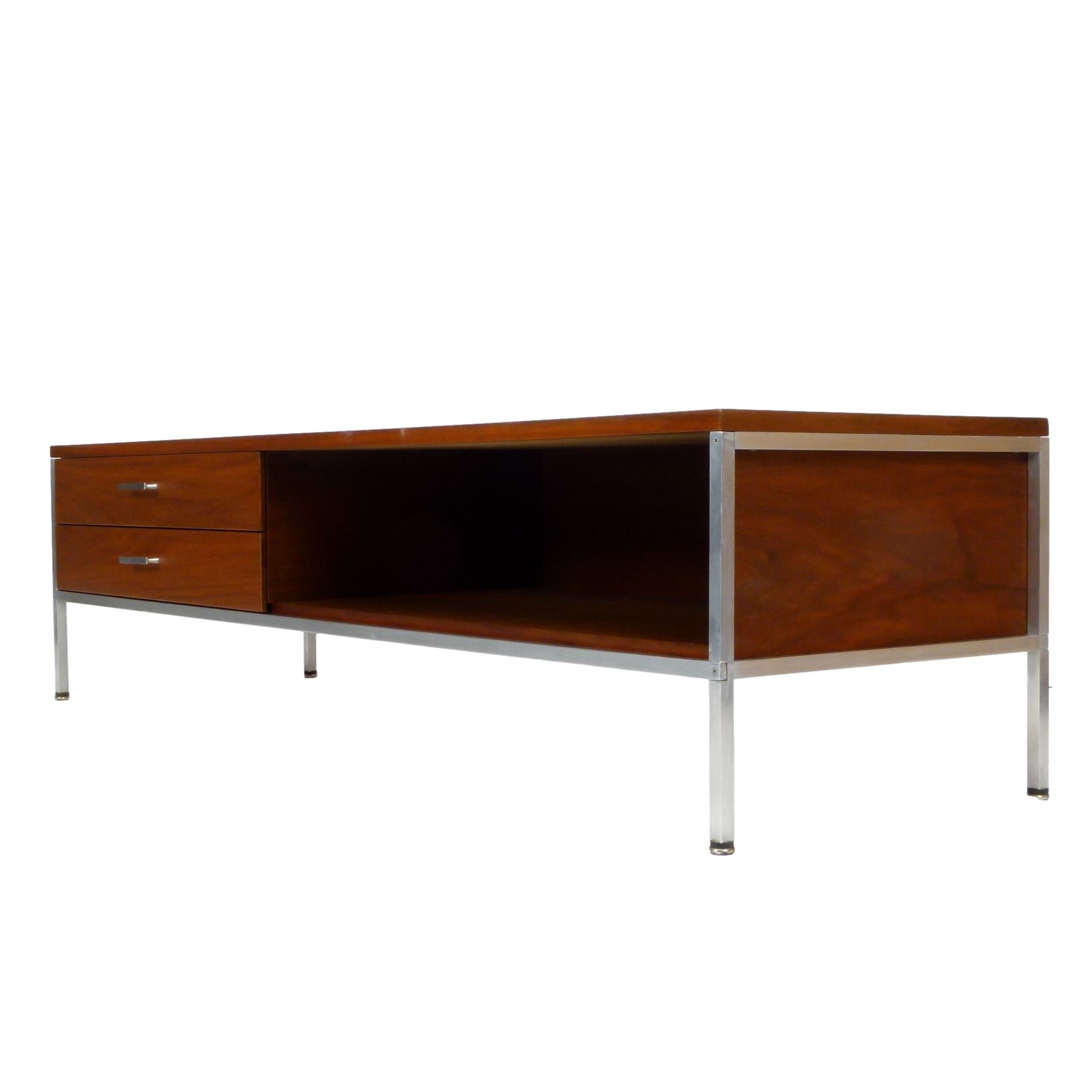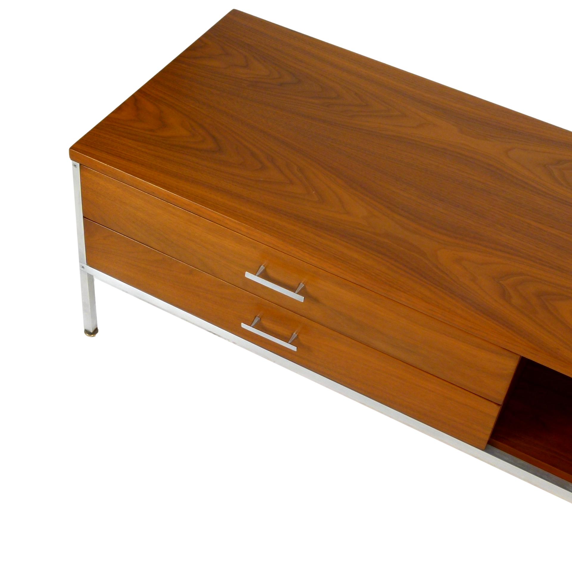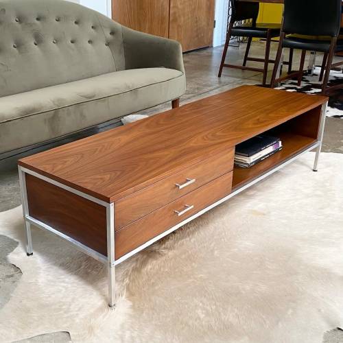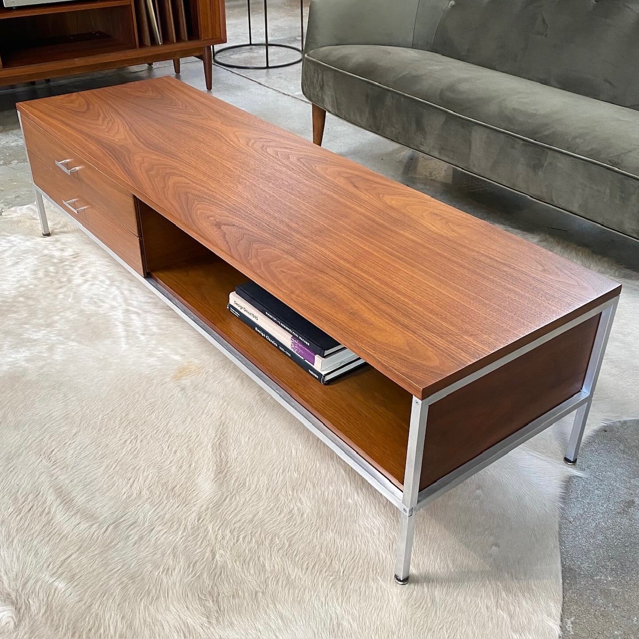 1960s Paul McCobb "Linear Group" walnut and aluminum coffee table for Calvin Furniture. Features an open shelf as well as two drawers. Stunning walnut grain throughout.