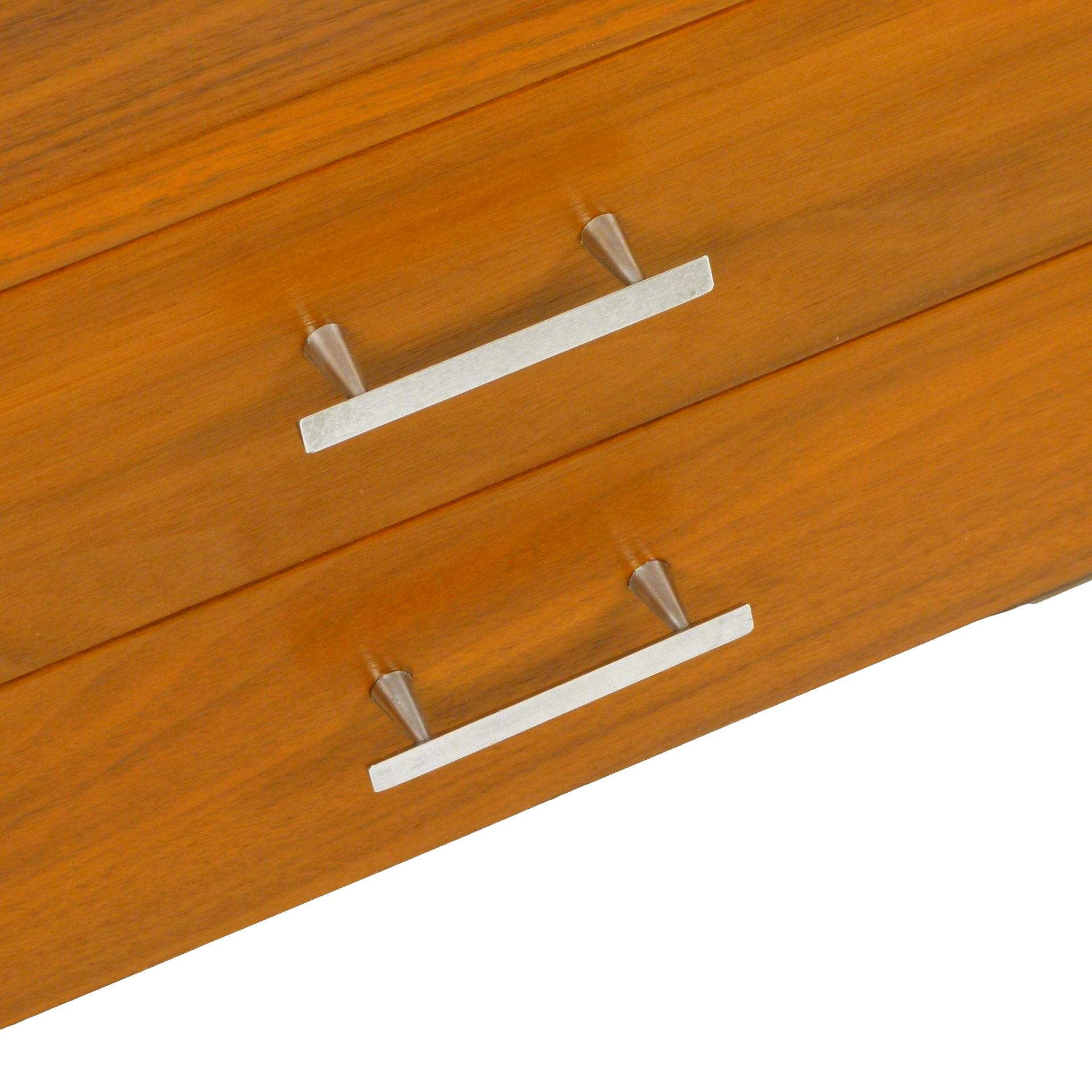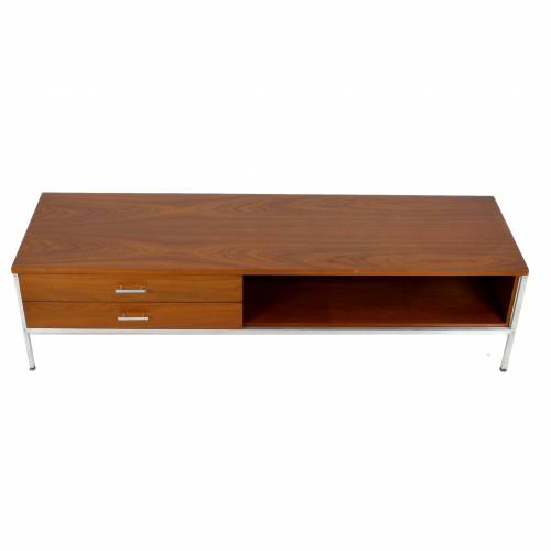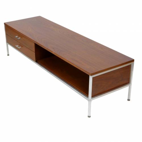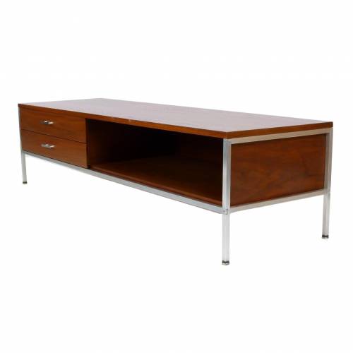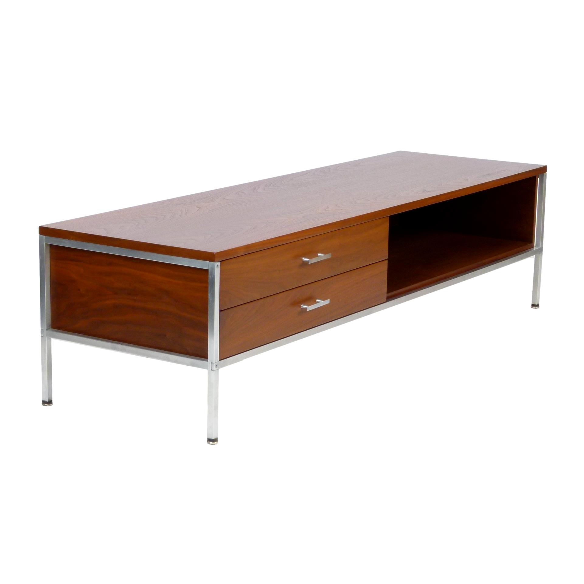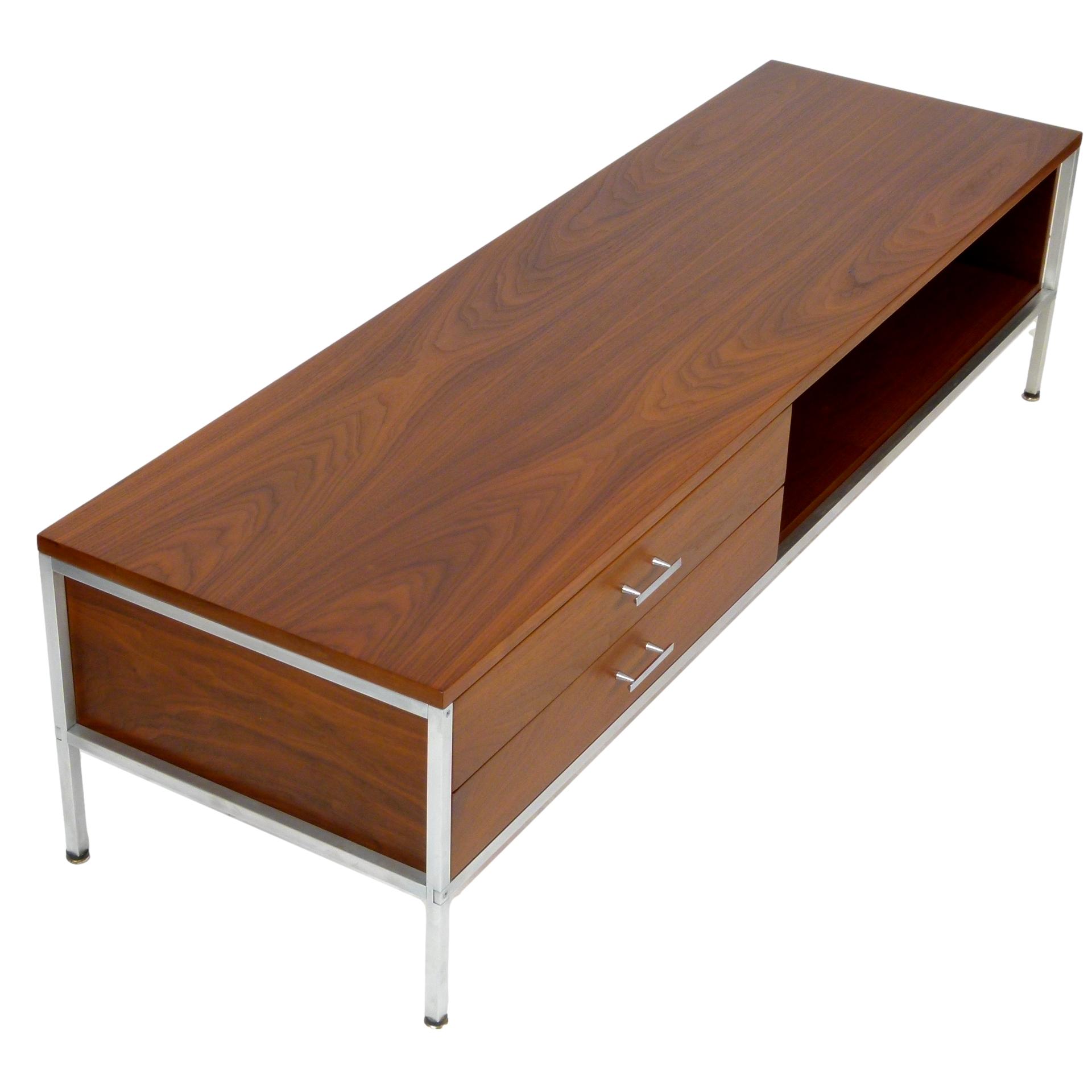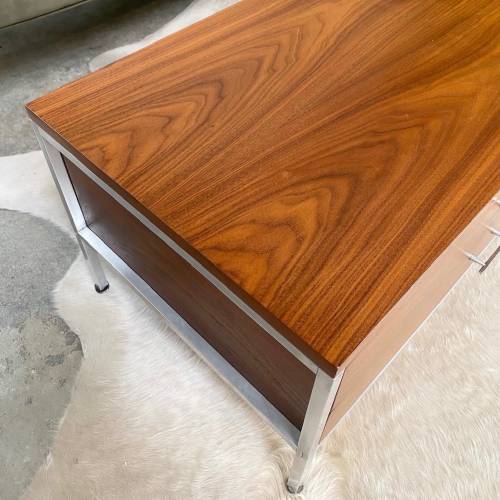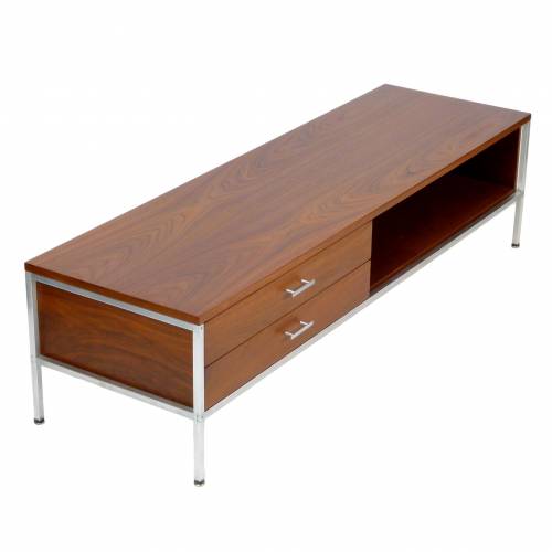 1960s Paul McCobb "Linear Group" walnut and aluminum coffee table for Calvin Furniture. Features an open shelf as well as two drawers. Stunning walnut grain throughout.