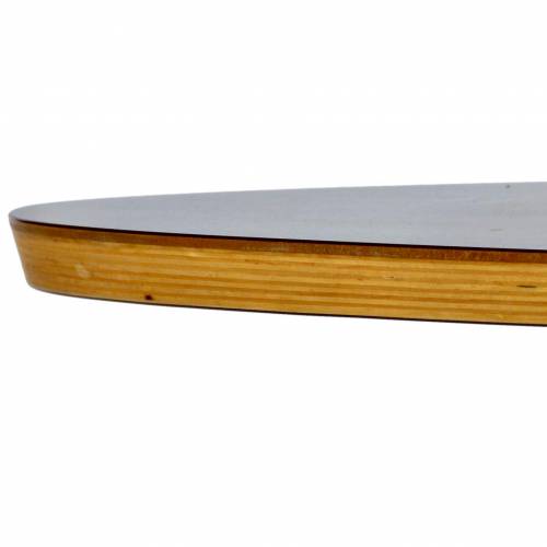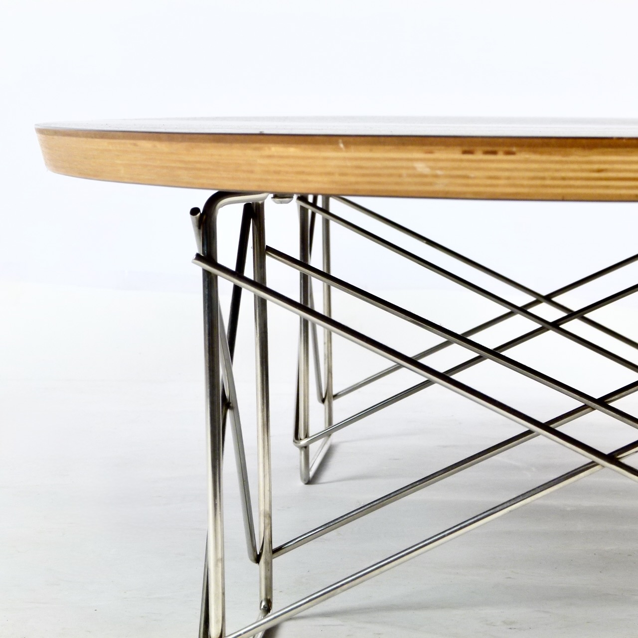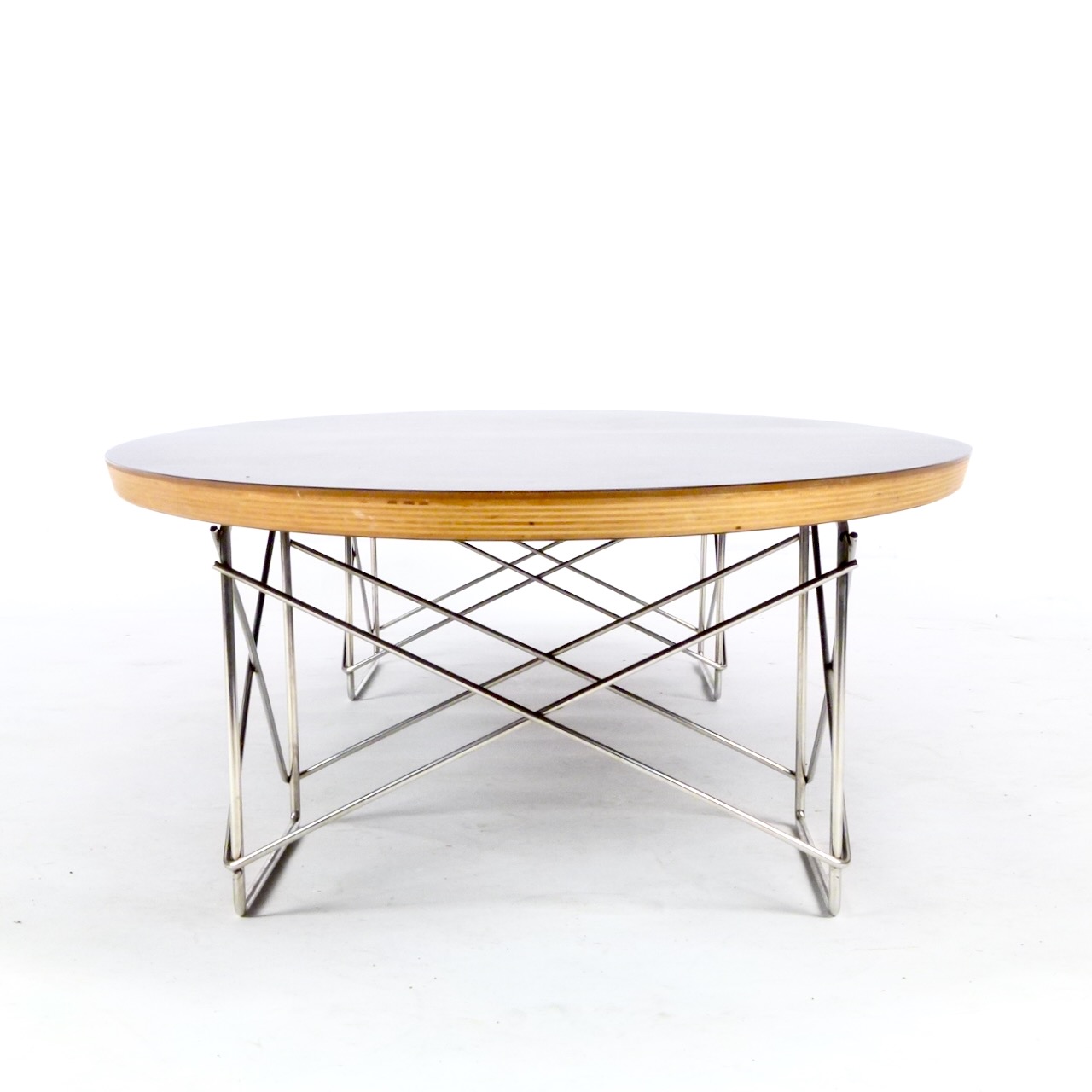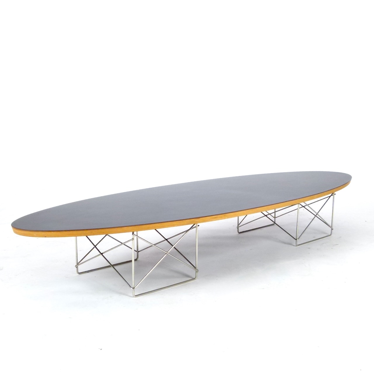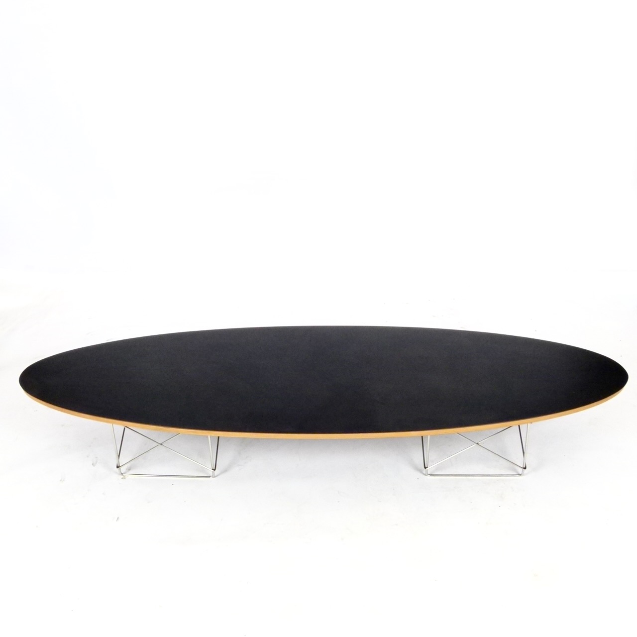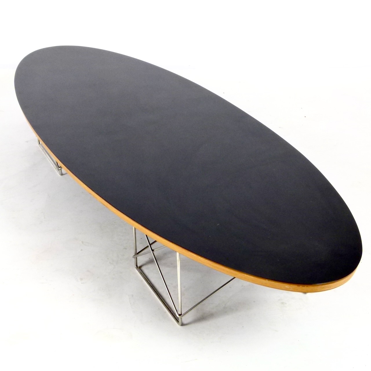 A Modernica production of the Eames' classic Elliptical coffee table in black laminate and plywood over chromed steel base.