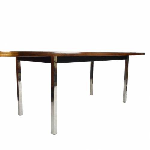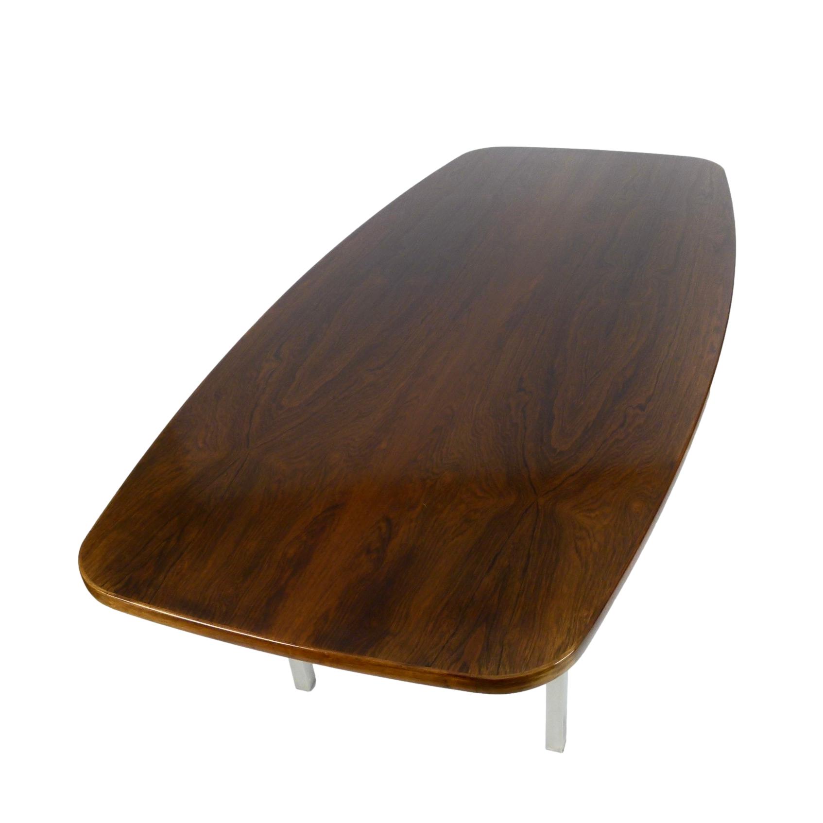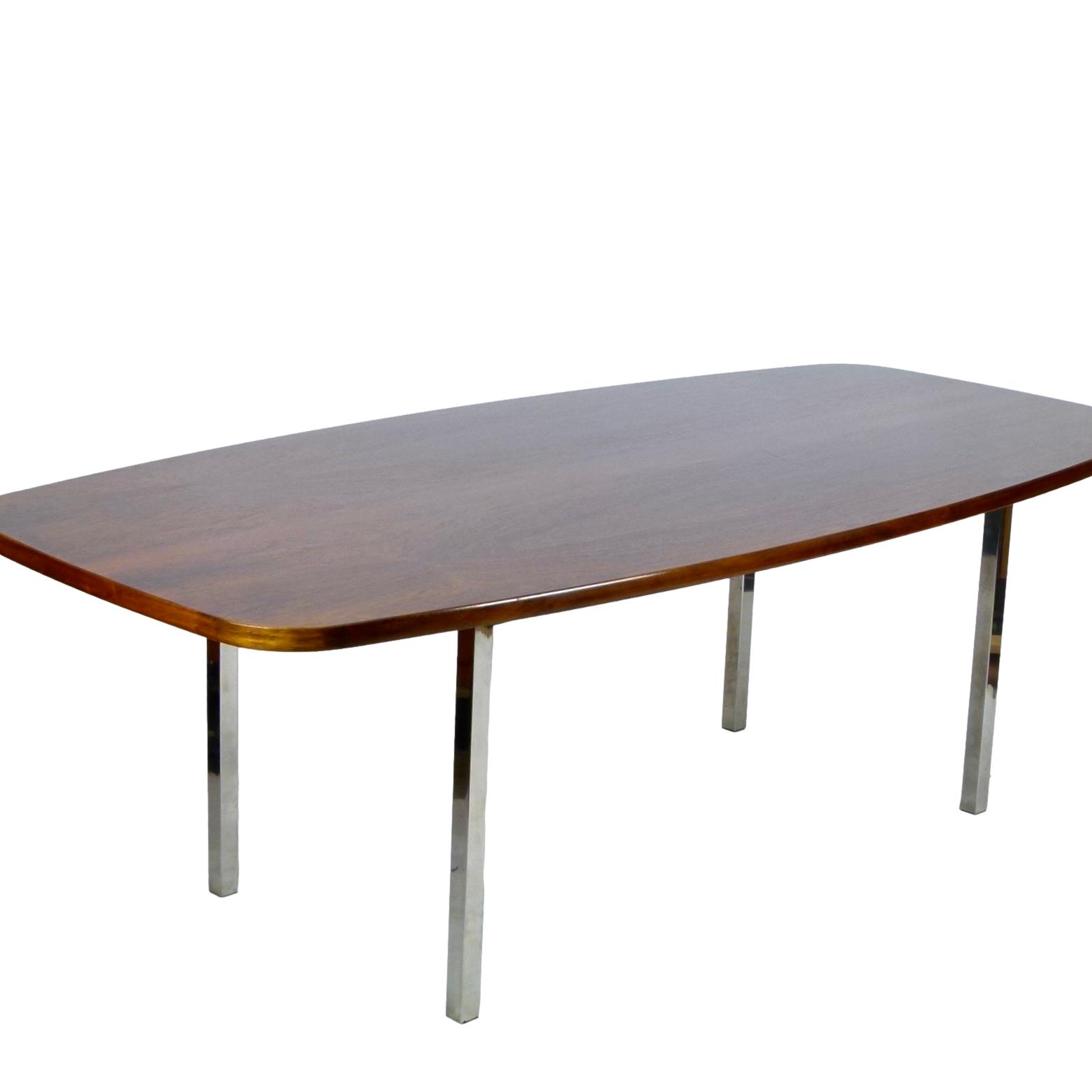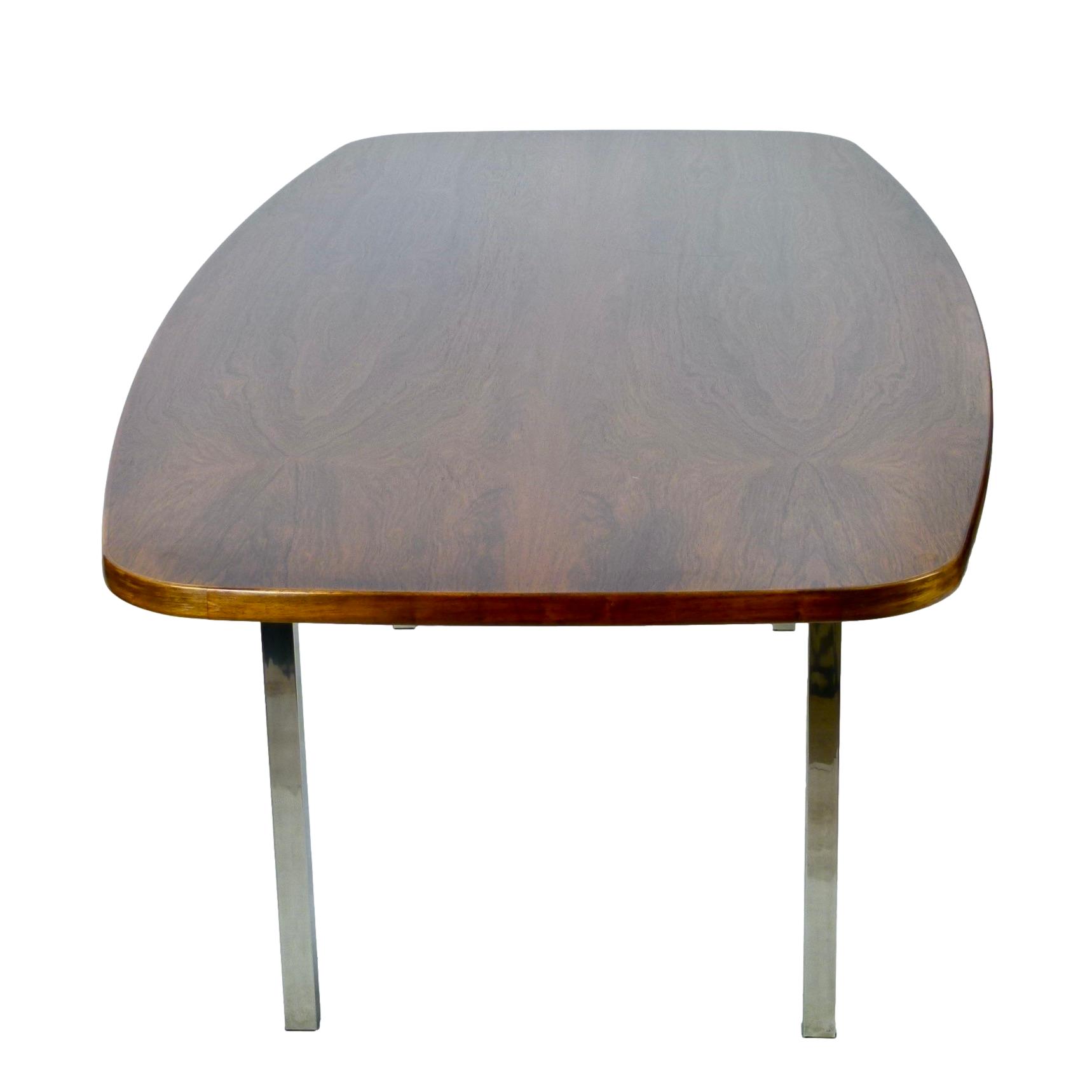 1970s dining or conference table in rosewood over polished stainless steel legs designed by Roger Sprunger for Dunbar. Comfortably seats 6.
