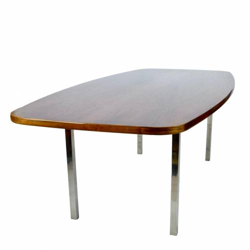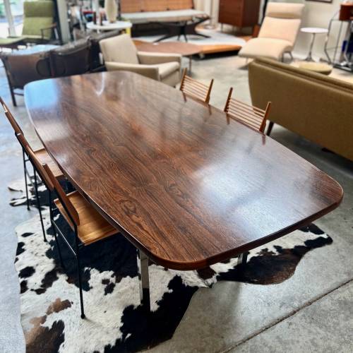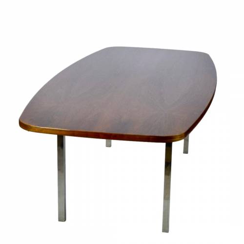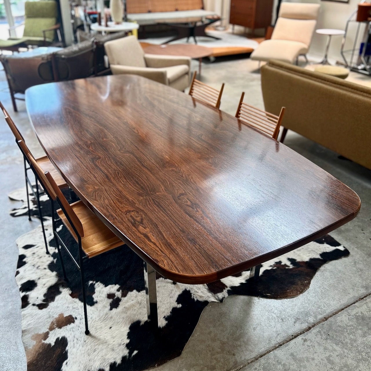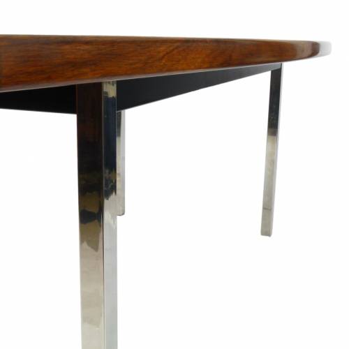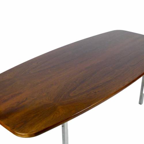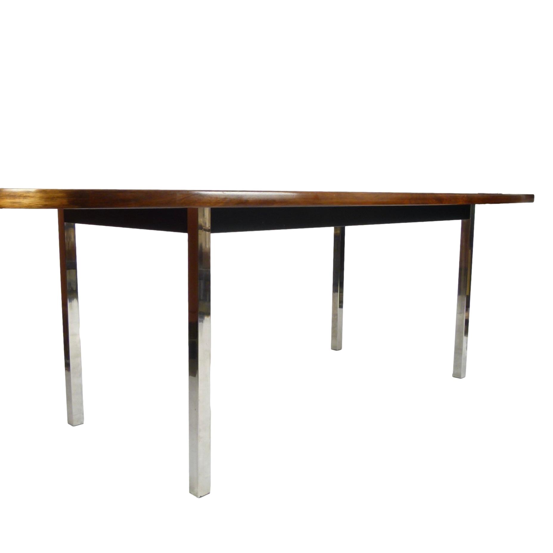 1970s dining or conference table in rosewood over polished stainless steel legs designed by Roger Sprunger for Dunbar. Comfortably seats 6.