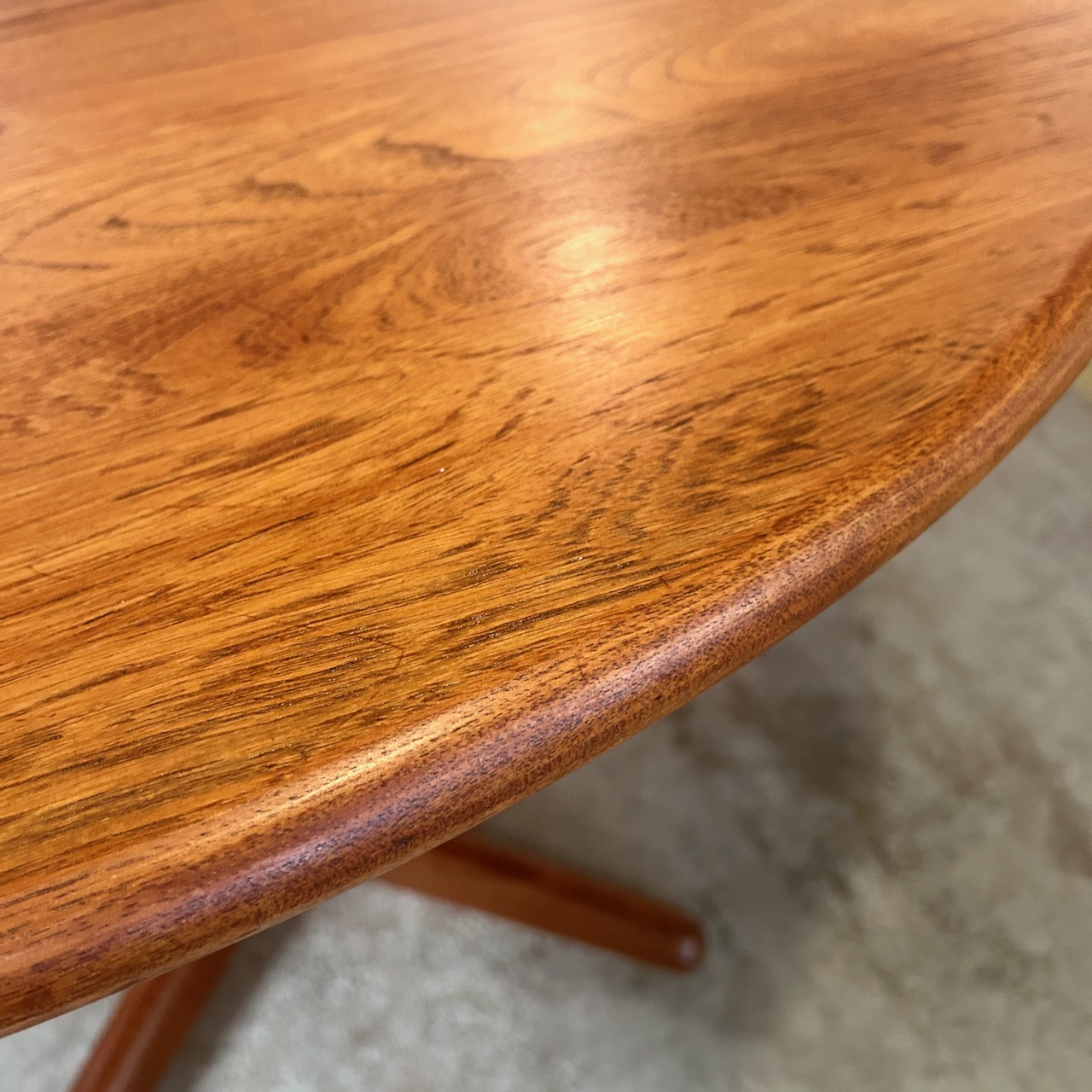 1960s round teak split pedestal dining table from Denmark with 2 - 20.5" leaves.