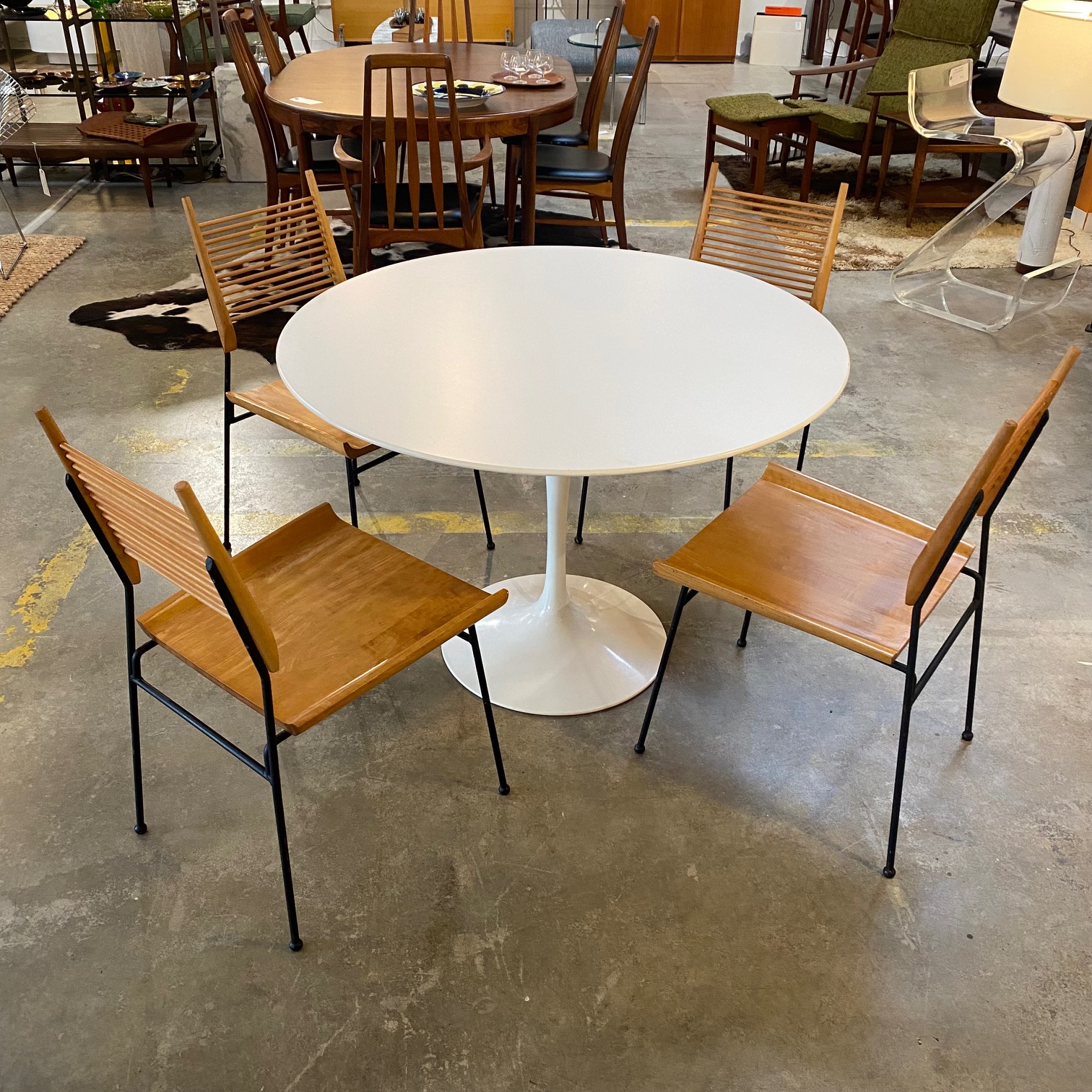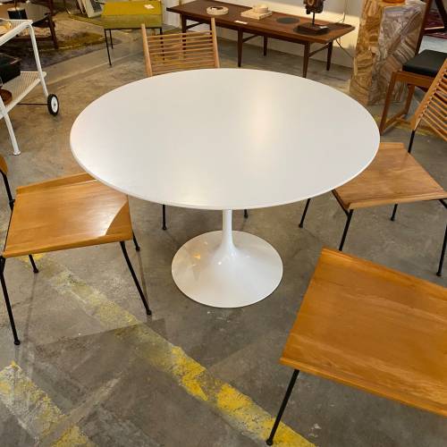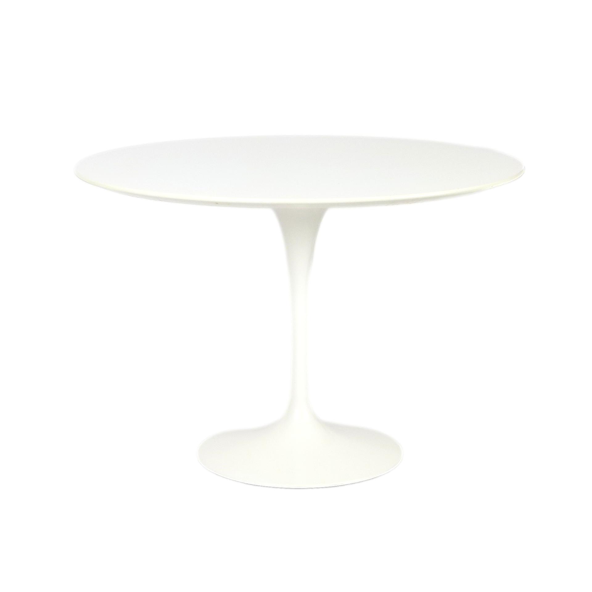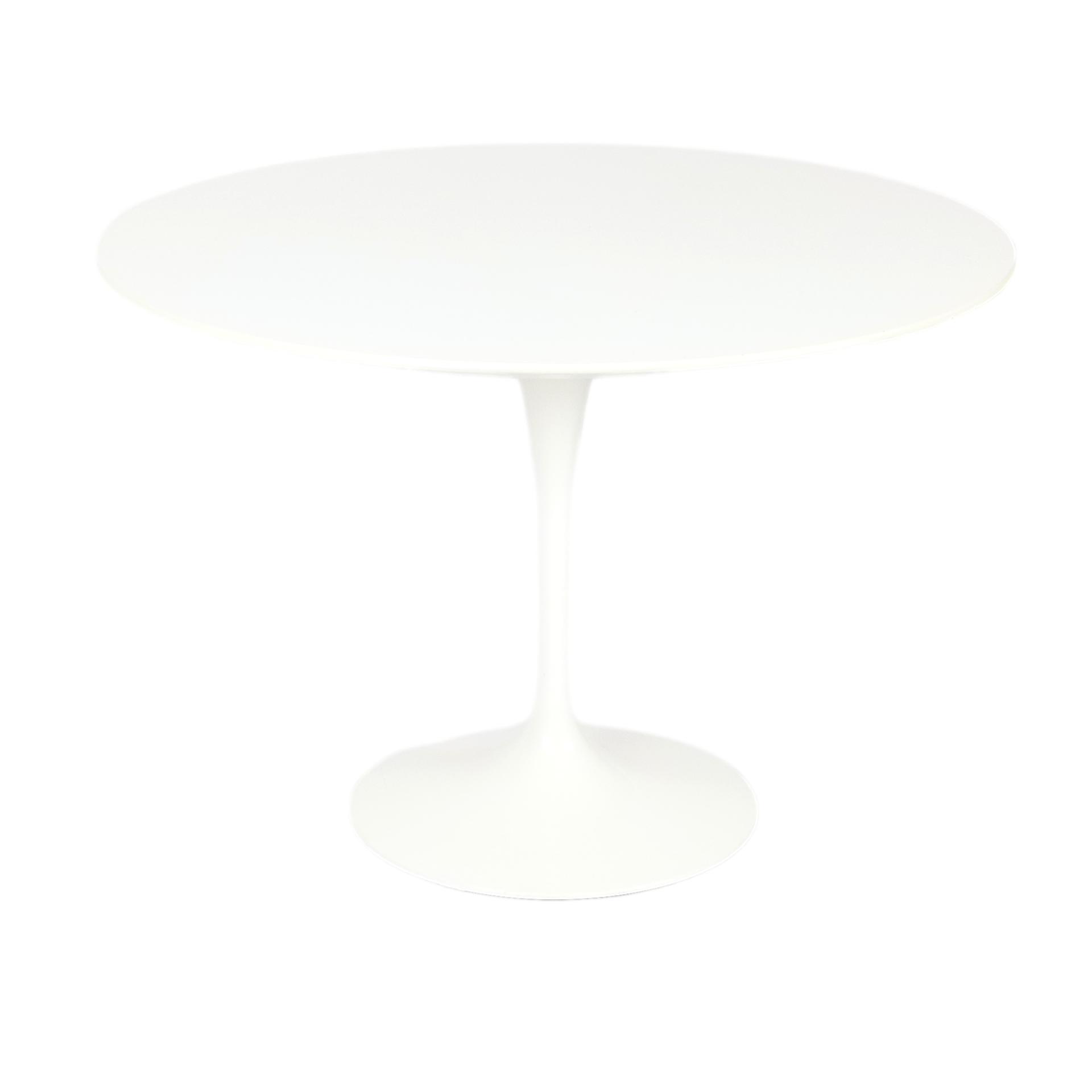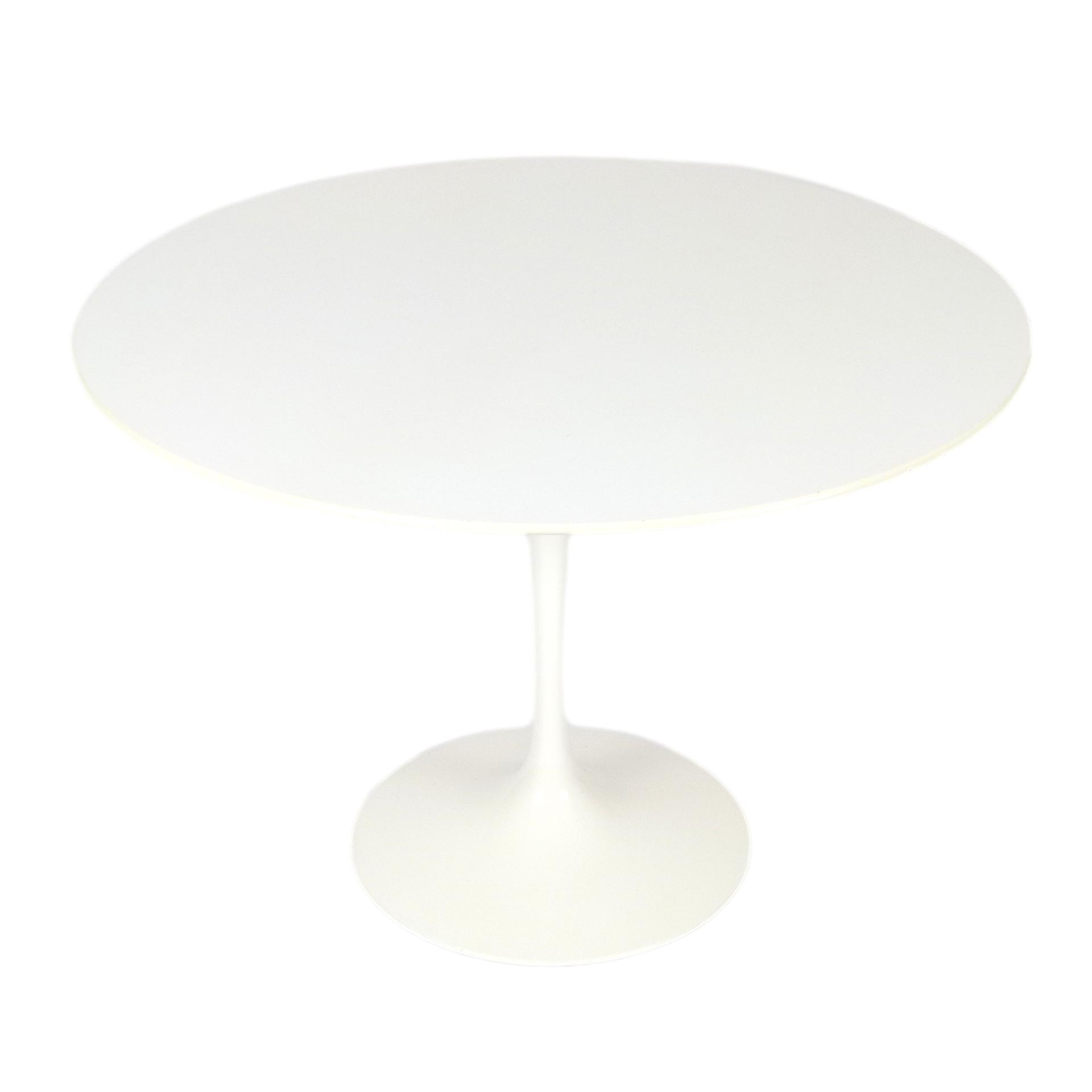 Tulip pedestal dining tables designed by Eero Saarinen for Knoll with original white base under laminate top. Newer authorized production by KnollStudio.