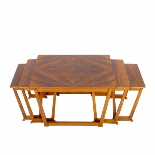 Set of five nesting tables in burl walnut from Sweden, c. 1960. Two pairs of smaller tables nest under each side of the largest table.